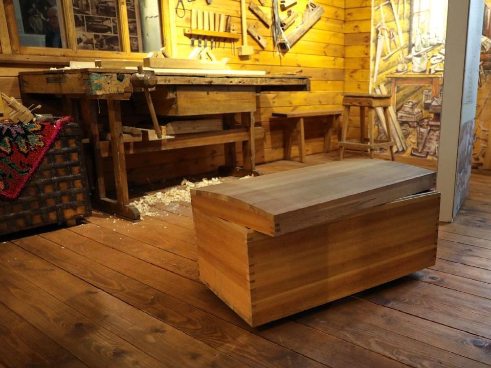 «Верстак и инструменты принадлежали столяру Георгию Кирееву, который проработал на фабрике 53 года. Он пришел молодым человеком на производство, и его наставник вручил ему этот верстак. И все годы он за ним отработал. К 45-летию фабрики он сделал макеты всех мебельных изделий, которые в разное время здесь выпускались, сегодня они установлены в музее. Наборы мебели «Слава», «Меридиан», «Универсал». Многие тюменцы помнят эту мебель», - говорит Сергей Киверин.