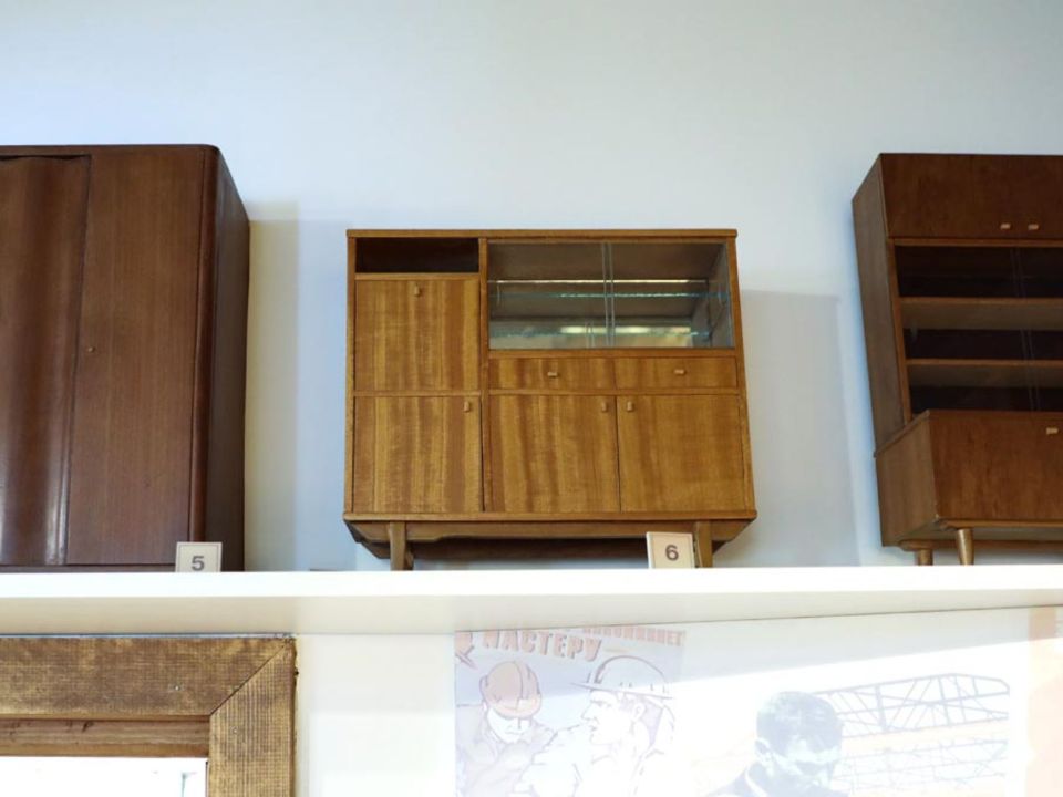 «У нас представлена мебель, которая производилась на фабрике в 1960-е годы. Например, буфеты, их можно увидеть у бабушек и дедушек дома или на дачах. Стол, трюмо, комод, стулья, зеркало… Видим, что использовалась модная для того времени отделка, а в качестве материала плотная древесина – береза или сосна», - рассказывает Сергей Аркадьевич.