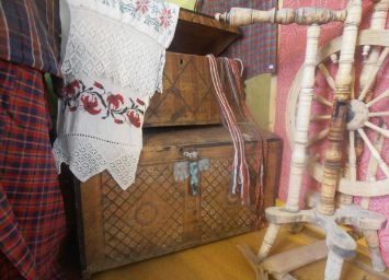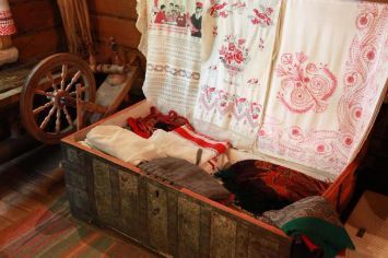 Перед гостями предстает деревянная русская изба с печкой, множество предметов крестьянского быта, и конечно, сундуки.