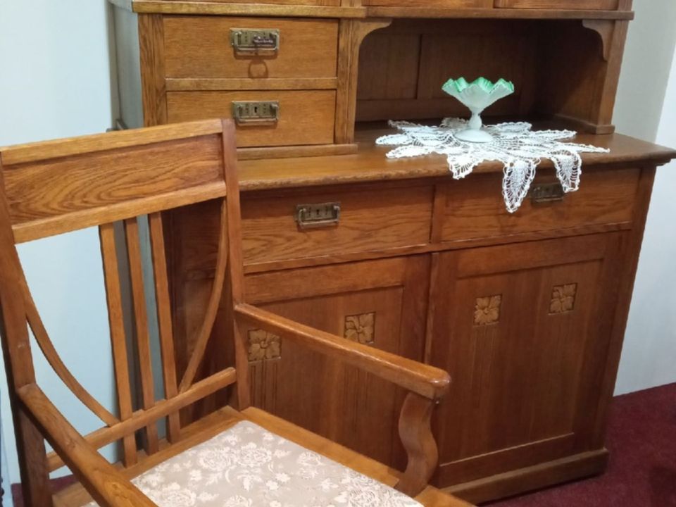 «Два дубовых кресла и буфет принадлежали тюменскому архитектору Марку Полочанскому, который спроектировал знаменитую круглую баню на Ленина. Эта мебель выполнена в ярко выраженном стиле модерн. Это одно из первых приобретений нашего музея», - отмечает Сергей Аркадьевич.