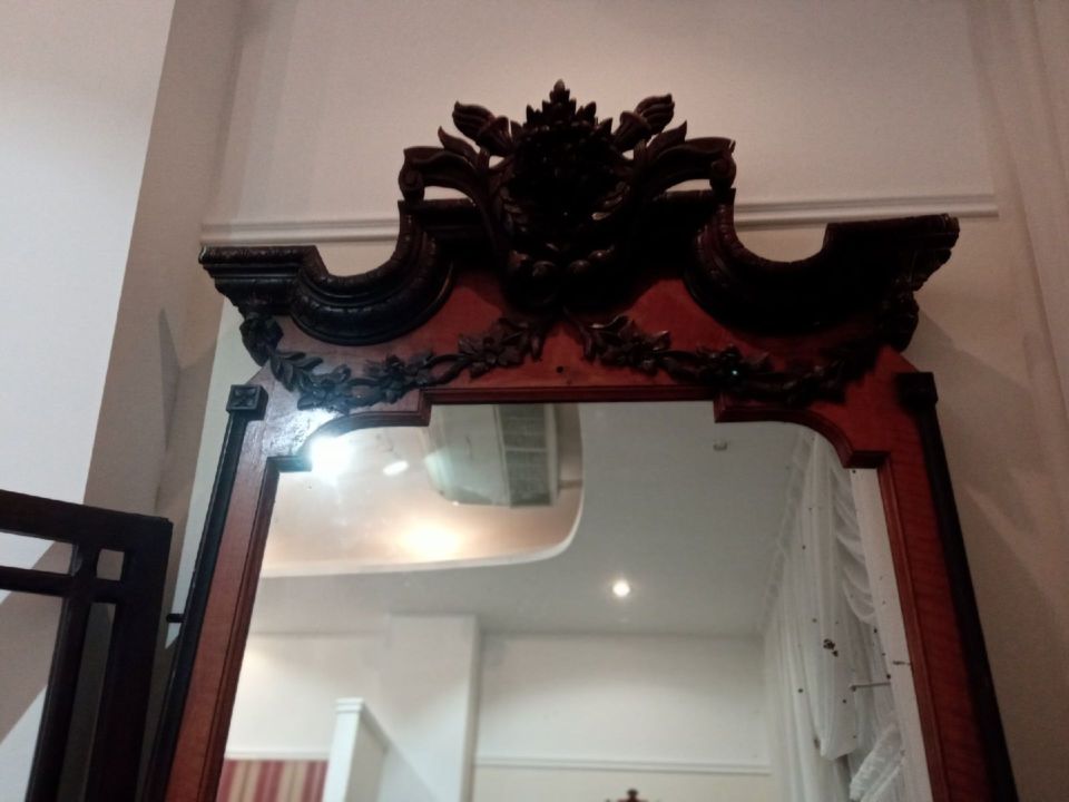Еще одно удивительное зеркало размером во всю стену знаменито не своей конструкцией, а своим хозяином. Оно принадлежало купцу Колмогорову. Сверху зеркало украшено резьбой. Это так называемое «навершие».