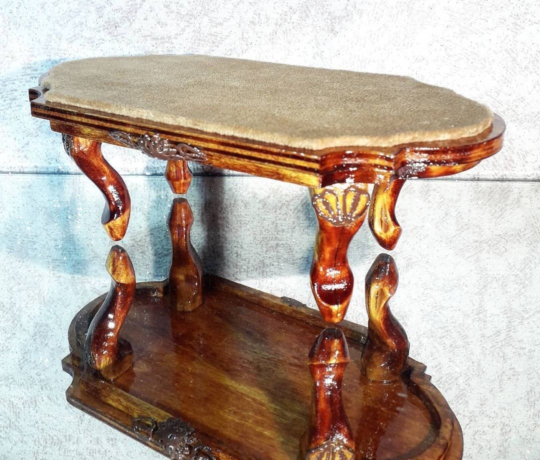 Сергей поясняет, что мебельная ткань для кукольных диванов и кресел не годится, она жесткая. Используется портьерная ткань. Набивкой служит поролон. Углы не сшиваются, как на обычной мебели, а склеиваются. Освоить такую ювелирную работу, чтобы еще не испачкать ткань, оказалось непросто. Нет-нет да и случаются помарки. В таких случаях мастер все переделывает. Каркас делается из дерева. Фанеру Сергей не признает. Говорит, что делать из нее мебель несерьезно. Предпочитает работать с липой и березой: липа хорошо режется, а береза хорошо обрабатывается. Дерево выпиливается обычным лобзиком. В арсенале у мастера также наждачная бумага, напильники, резцы, клей, лаки.