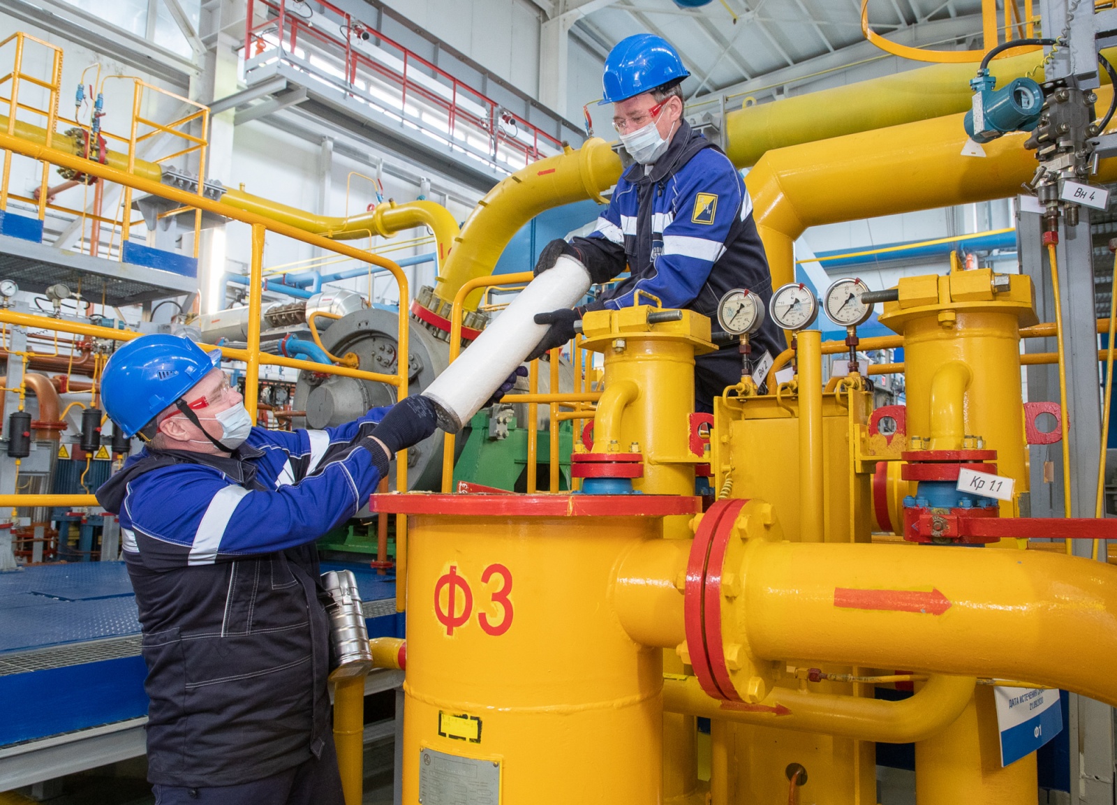 Производственный персонал Нефтегазодобывающего управления производит замену фильтрующего элемента фильтра пускового газа турбокомпрессорного агрегата.