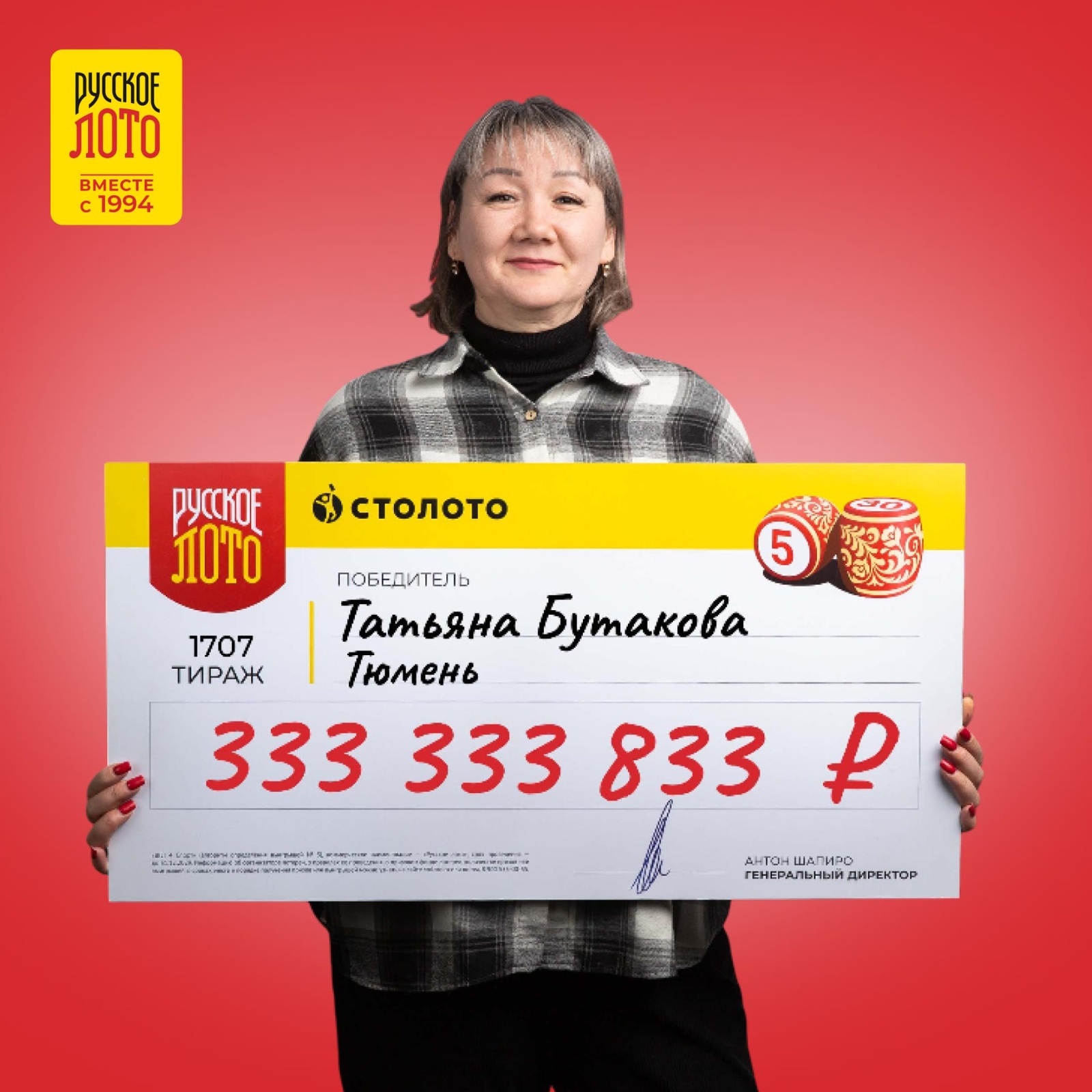 Татьяна Бутакова из Тюмени стала третьим мультимиллионером новогоднего розыгрыша в лотерею. Она выиграла 333 млн 333 тыс. 833 руб.