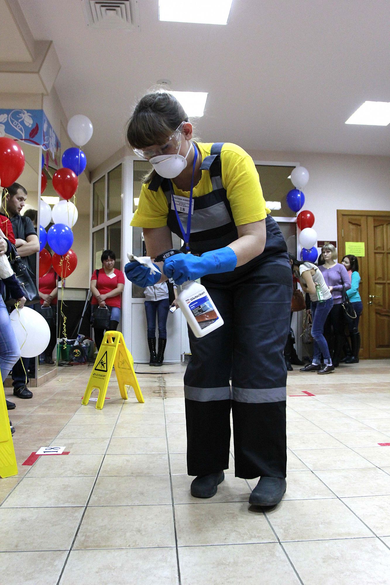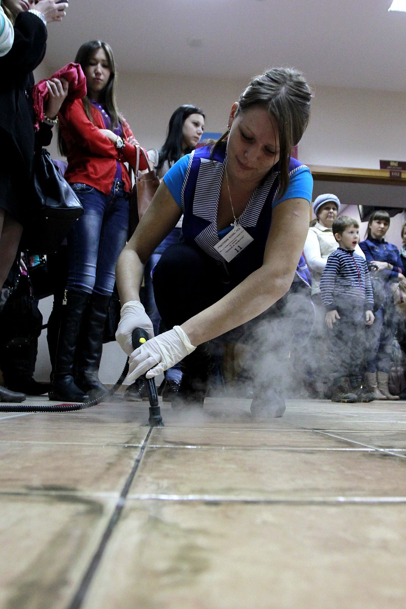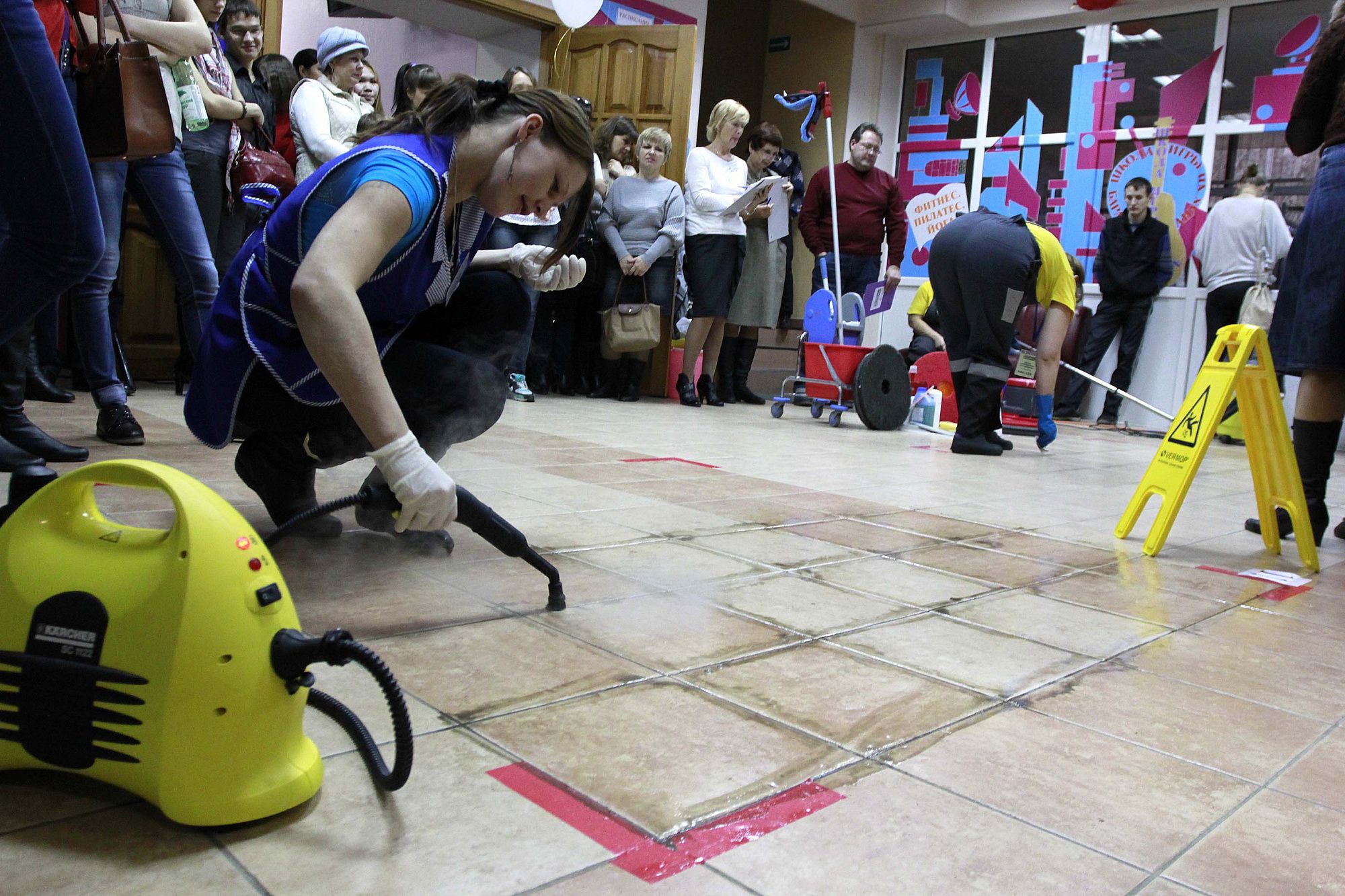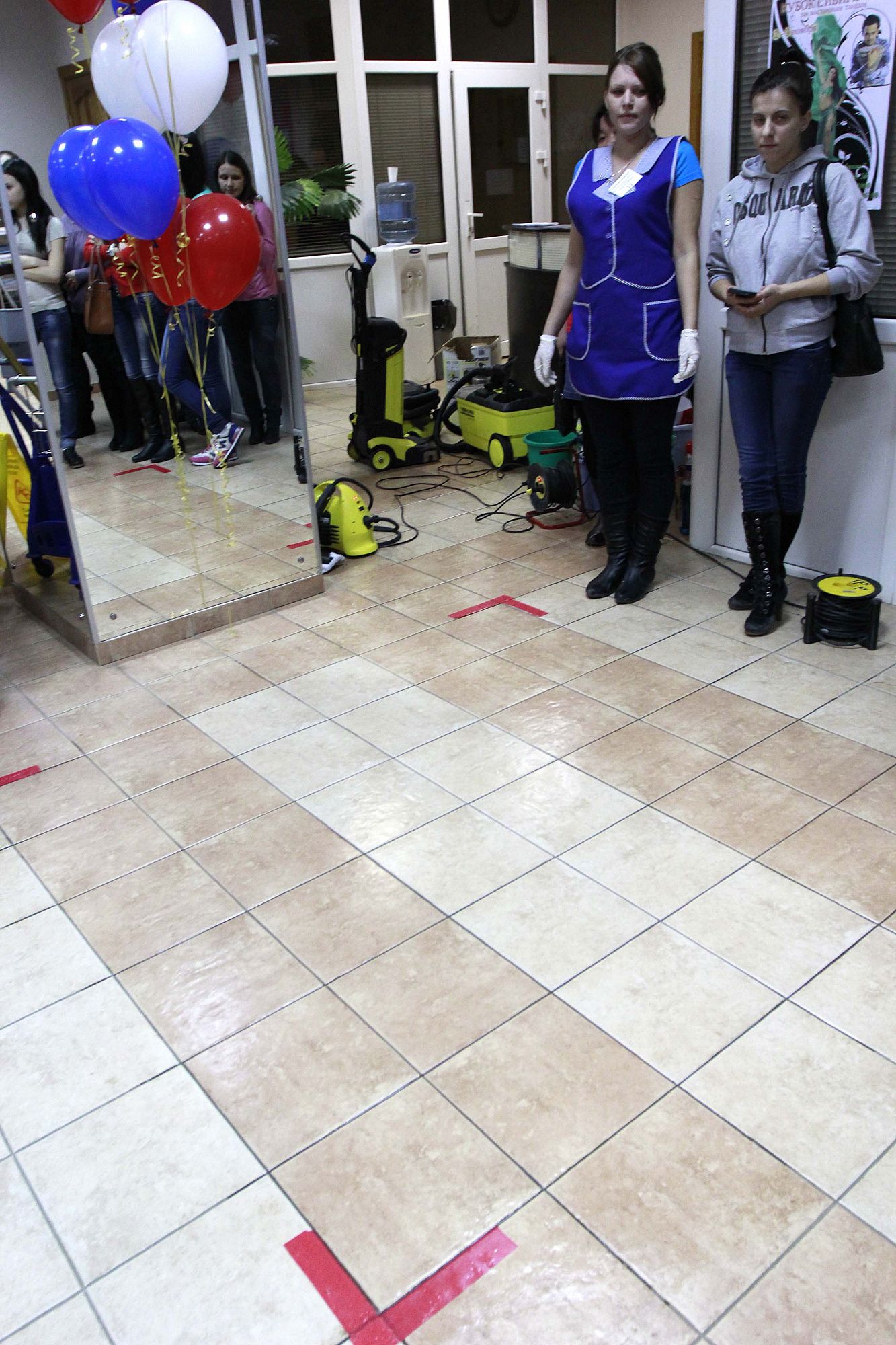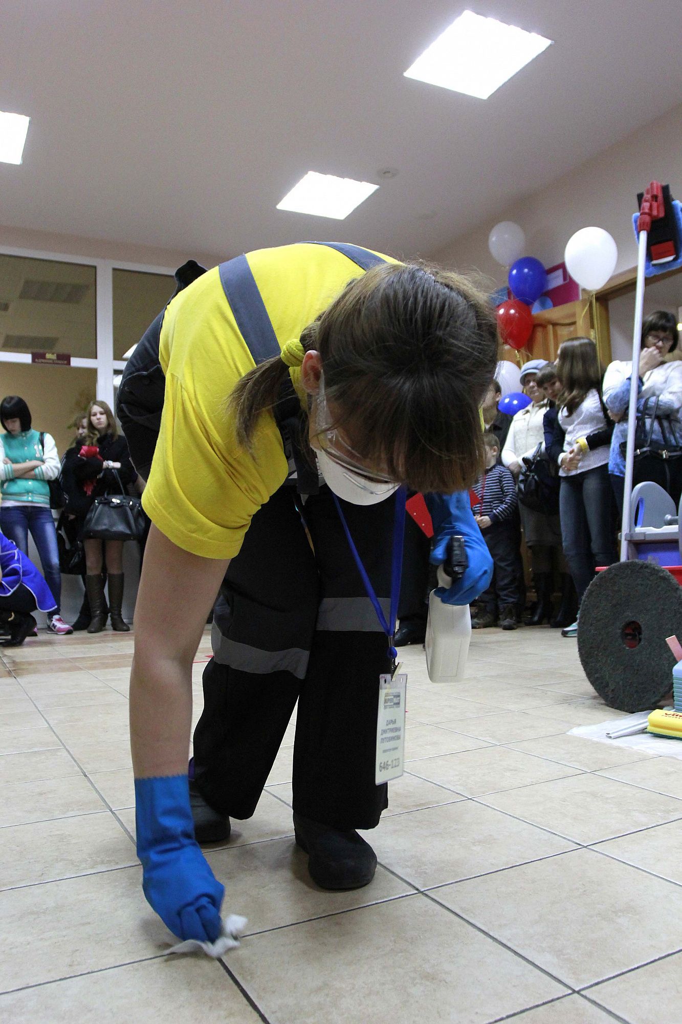Сначала на арену чистоты вышли тяжело вооруженные уборщики, которые целых полчаса зачищали 10 секций плитки на полу дворца культуры. На этом этапе в бой пошло все оборудование, имевшееся в наличии компаний, отправивших своих мастеров на соревнование. Правда, кое-кому не повезло: из-за неисправной проводки одной участнице пришлось чистить плитку щеткой, по старинке. Затем электричество дали и она вернулась в борьбу уже на равных.