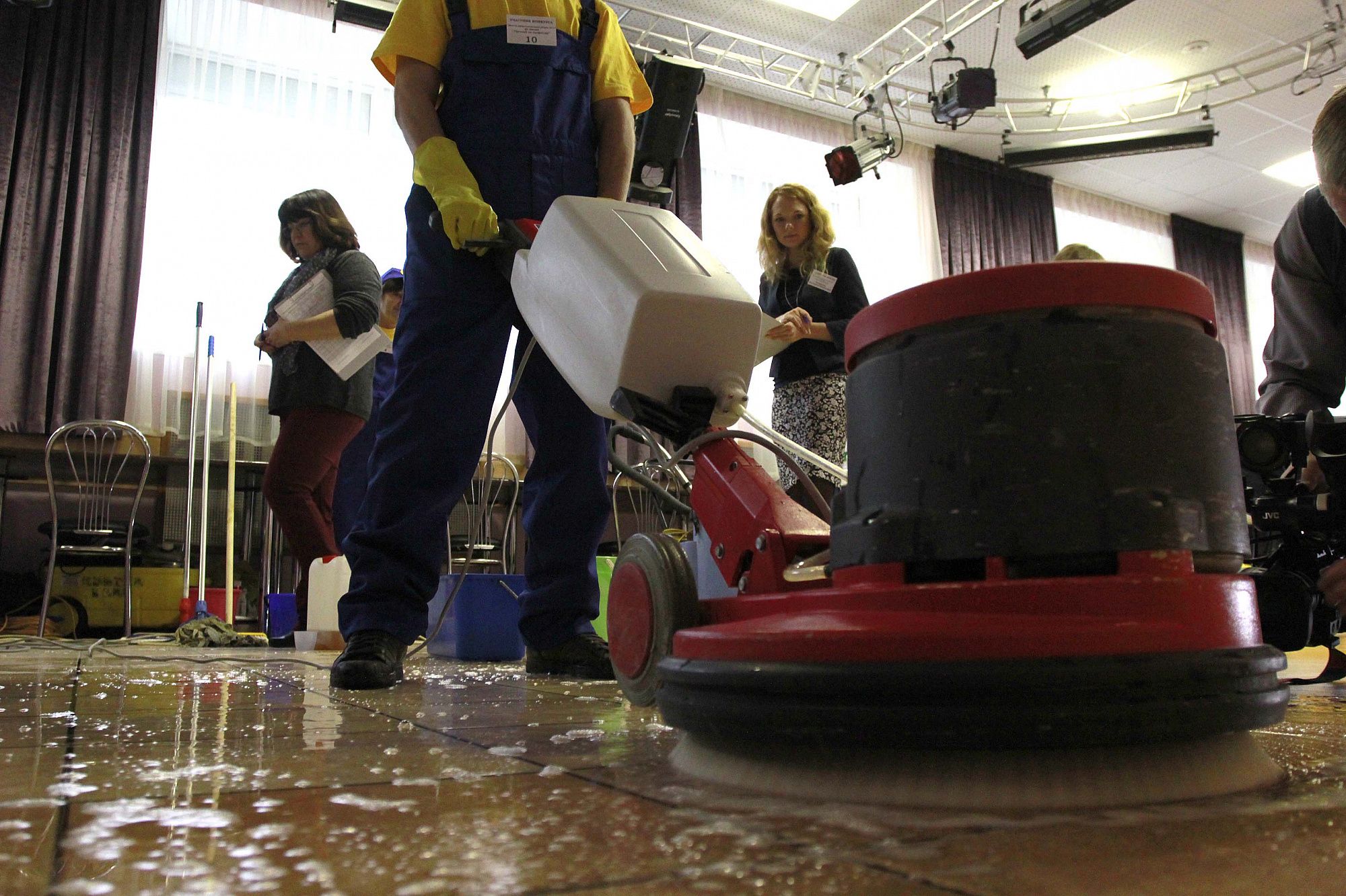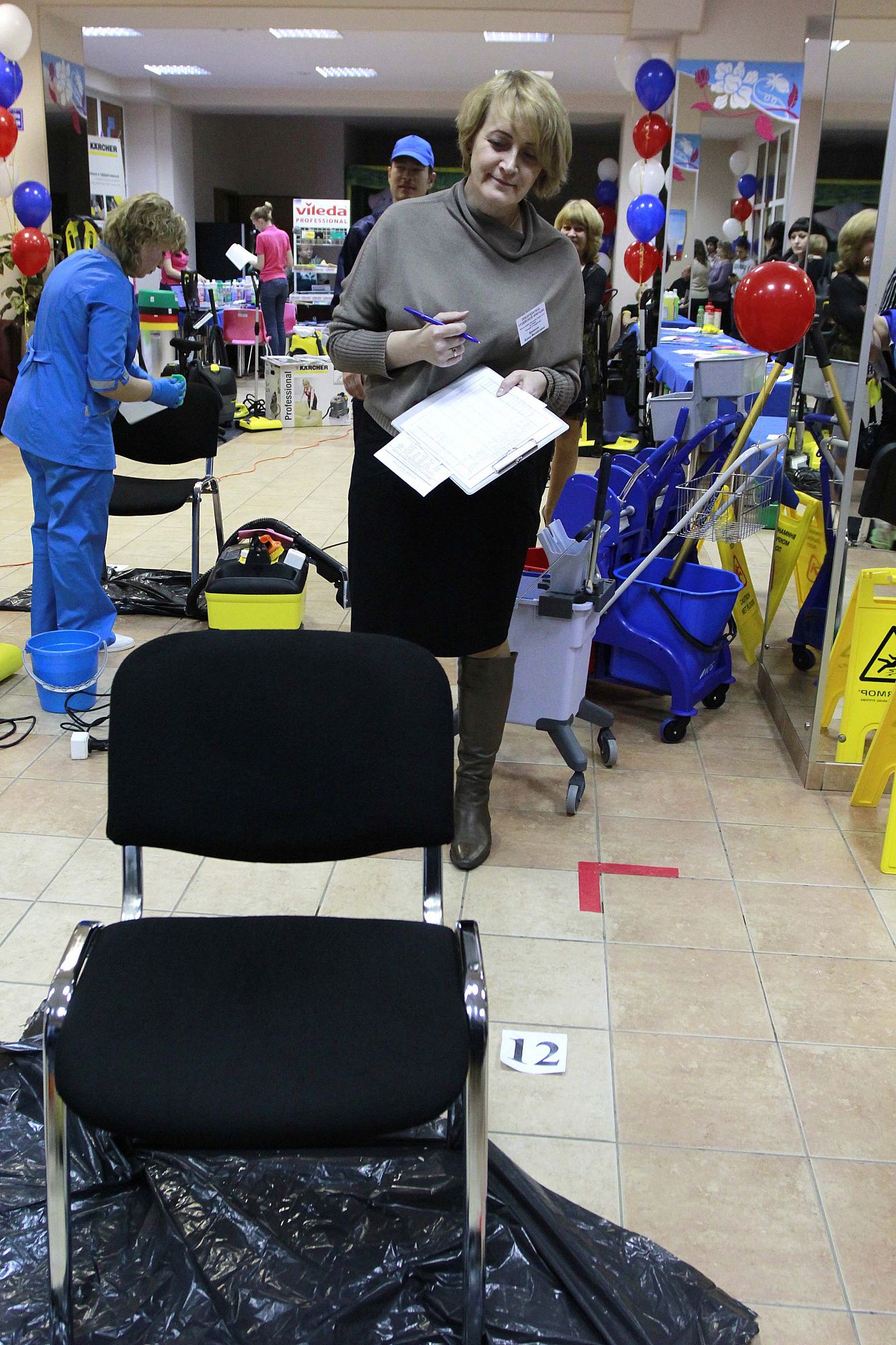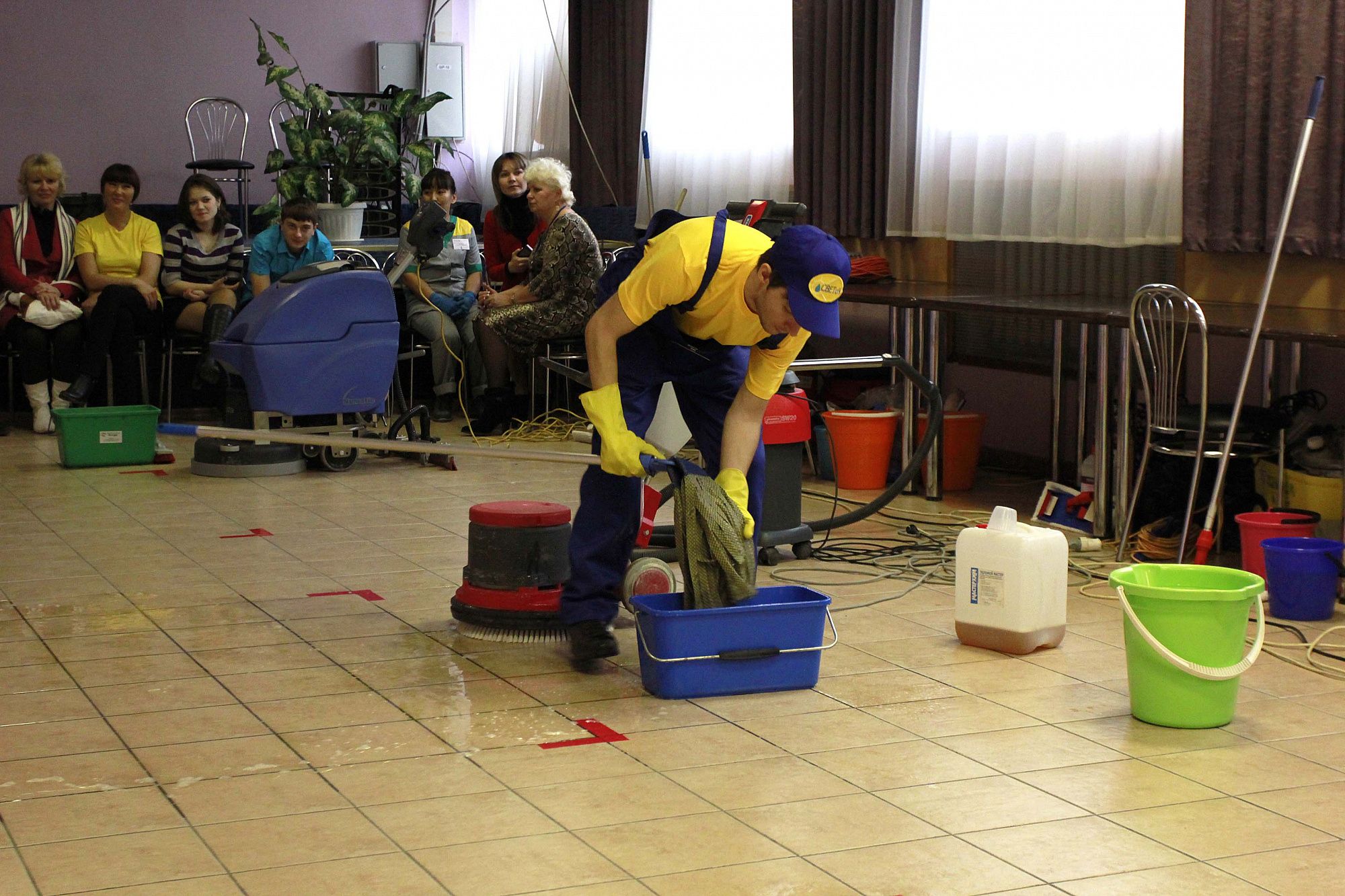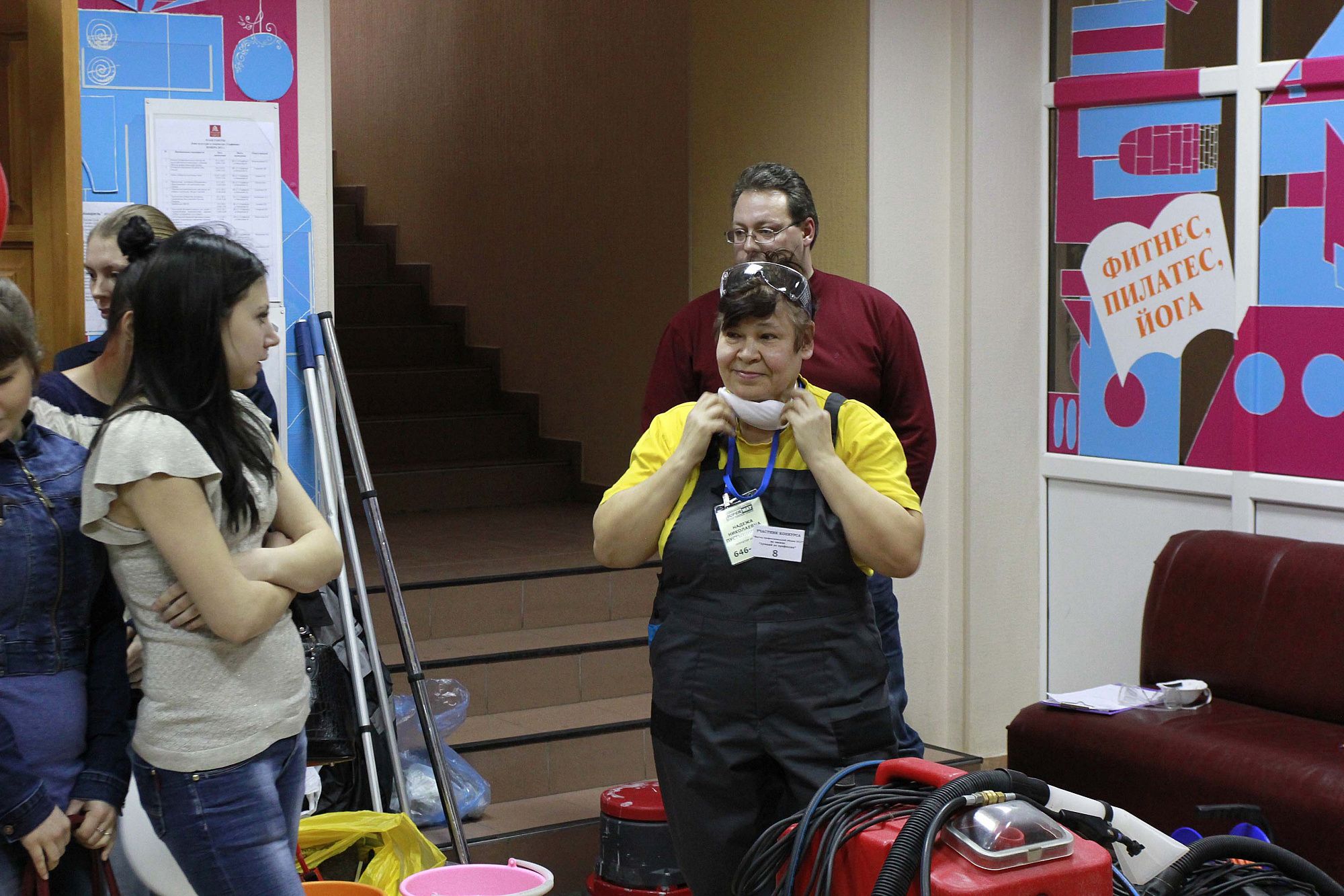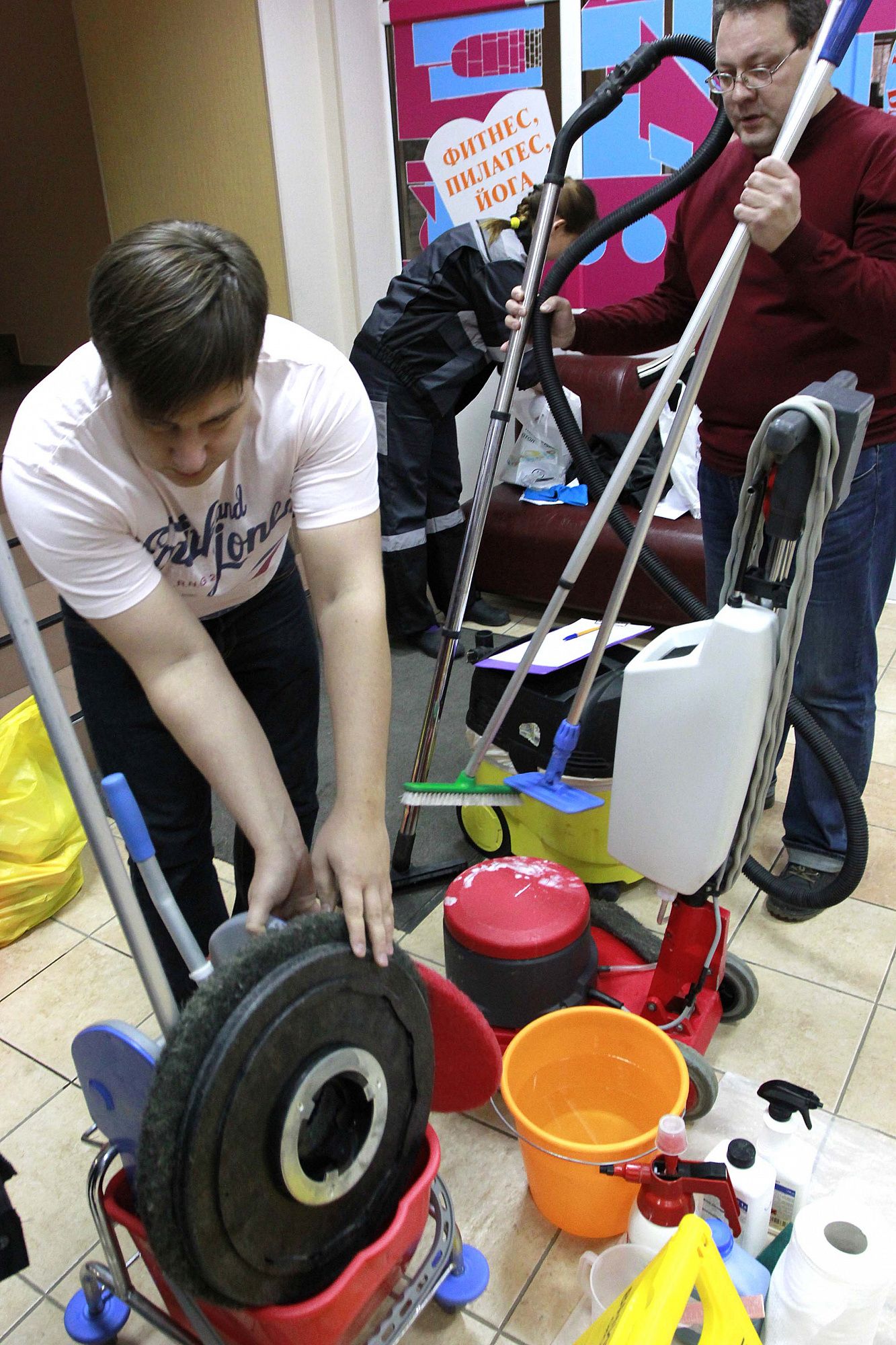Сначала на арену чистоты вышли тяжело вооруженные уборщики, которые целых полчаса зачищали 10 секций плитки на полу дворца культуры. На этом этапе в бой пошло все оборудование, имевшееся в наличии компаний, отправивших своих мастеров на соревнование. Правда, кое-кому не повезло: из-за неисправной проводки одной участнице пришлось чистить плитку щеткой, по старинке. Затем электричество дали и она вернулась в борьбу уже на равных.