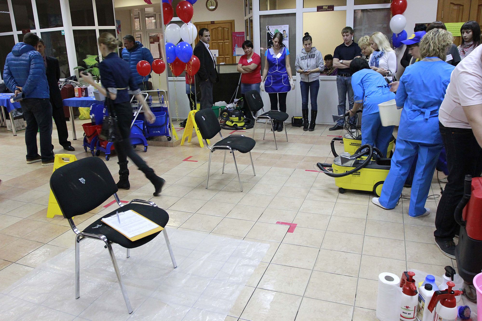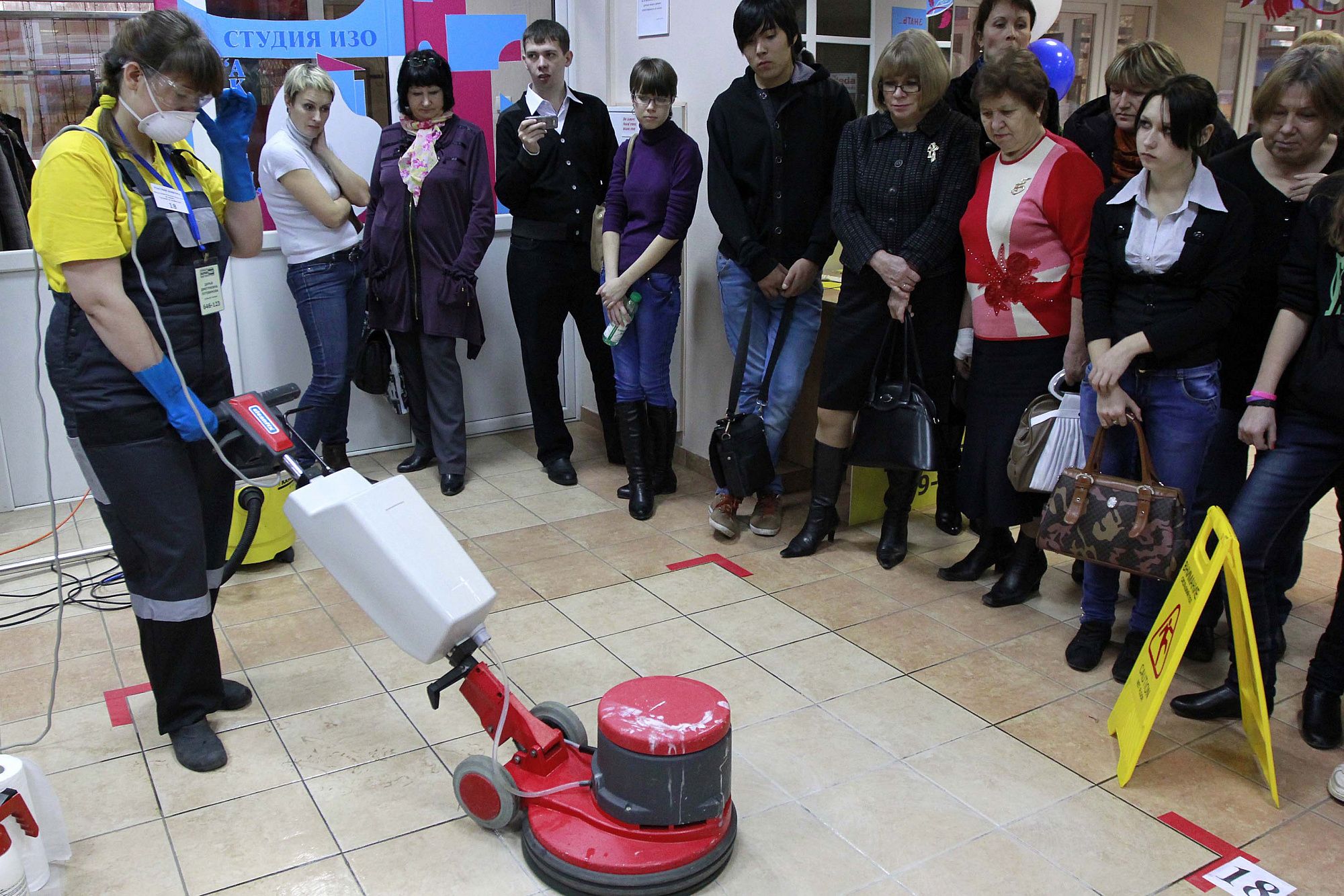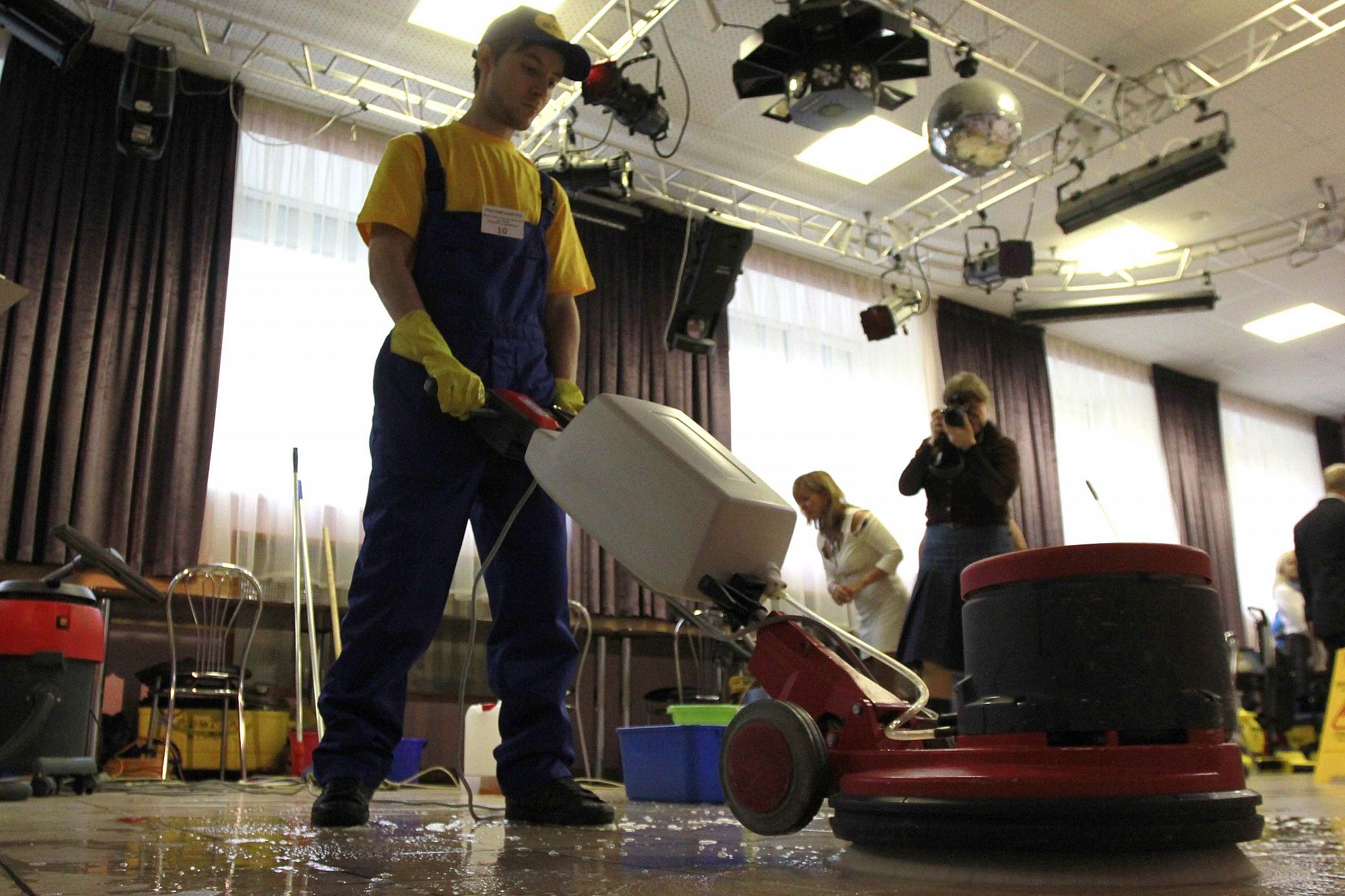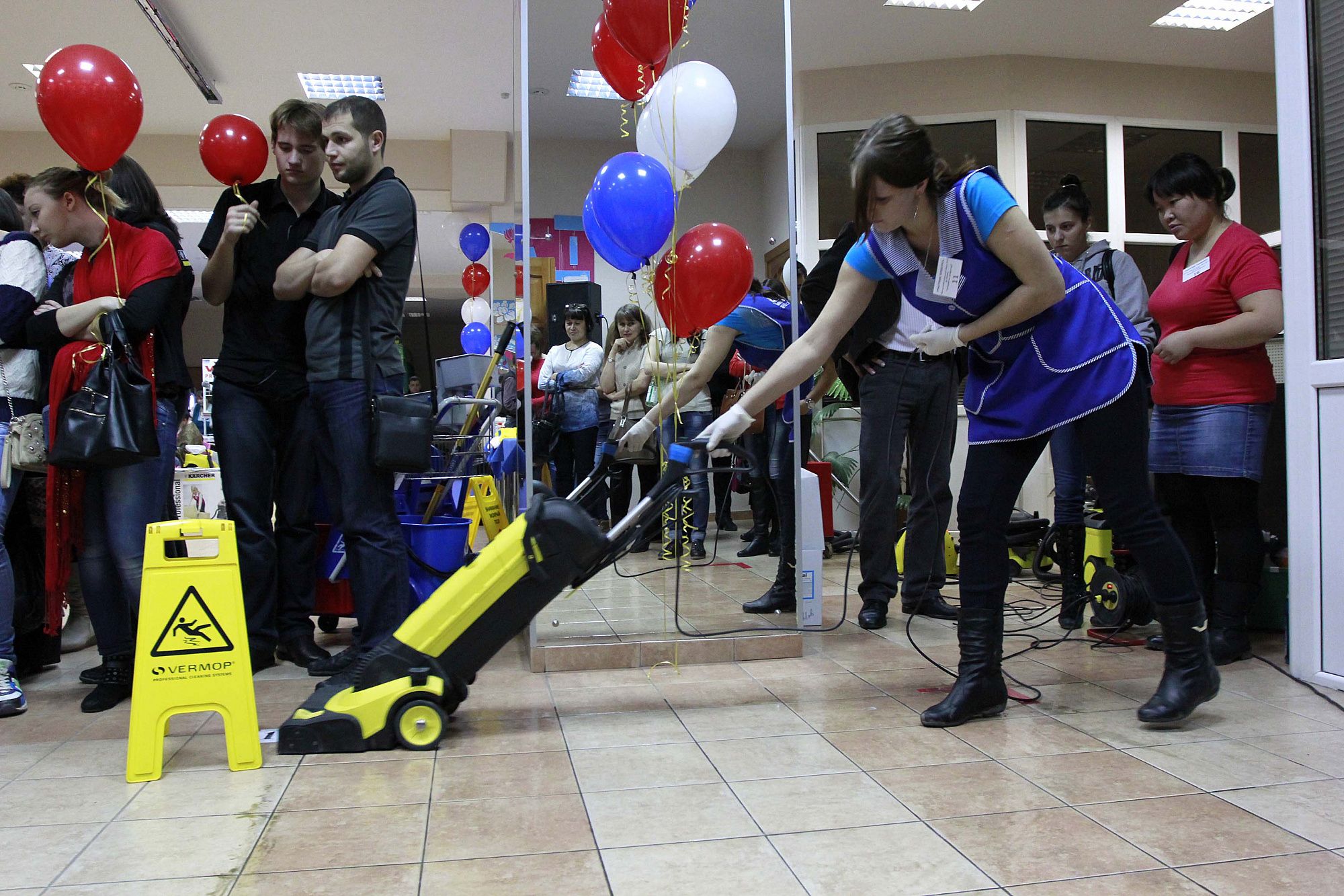 Сначала на арену чистоты вышли тяжело вооруженные уборщики, которые целых полчаса зачищали 10 секций плитки на полу дворца культуры. На этом этапе в бой пошло все оборудование, имевшееся в наличии компаний, отправивших своих мастеров на соревнование. Правда, кое-кому не повезло: из-за неисправной проводки одной участнице пришлось чистить плитку щеткой, по старинке. Затем электричество дали и она вернулась в борьбу уже на равных.