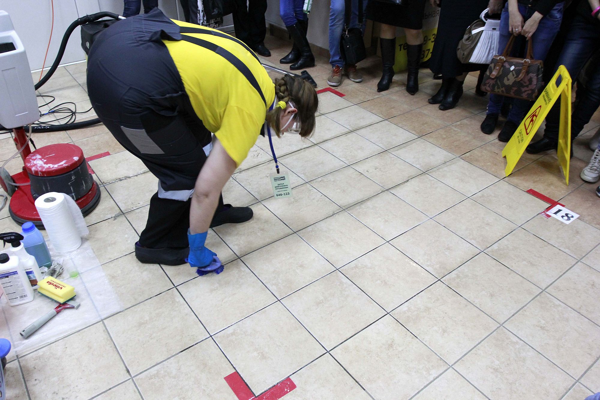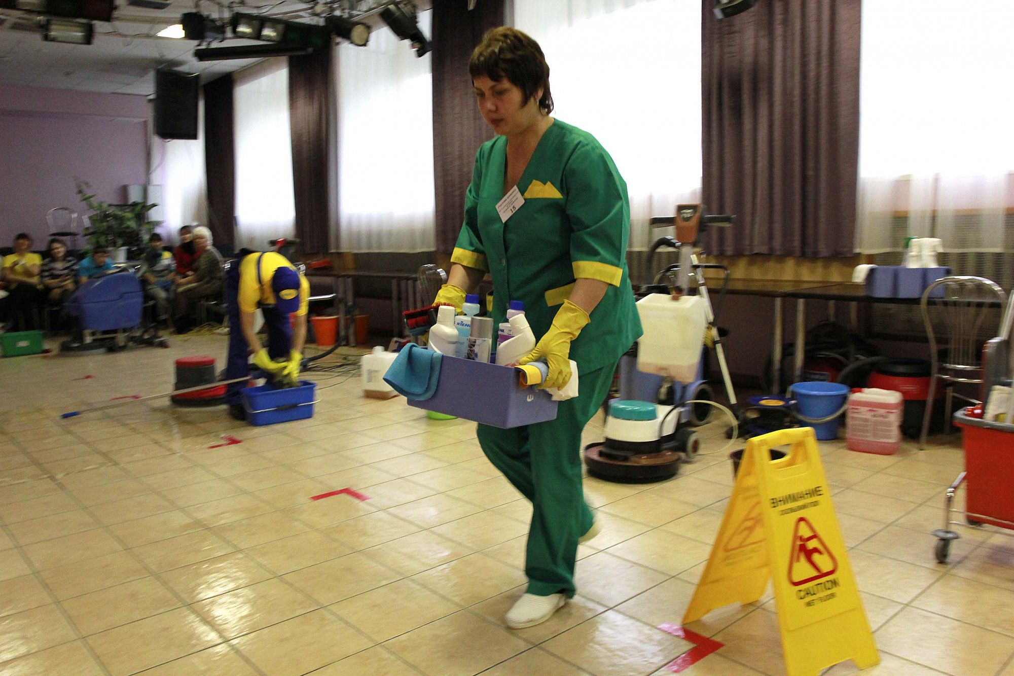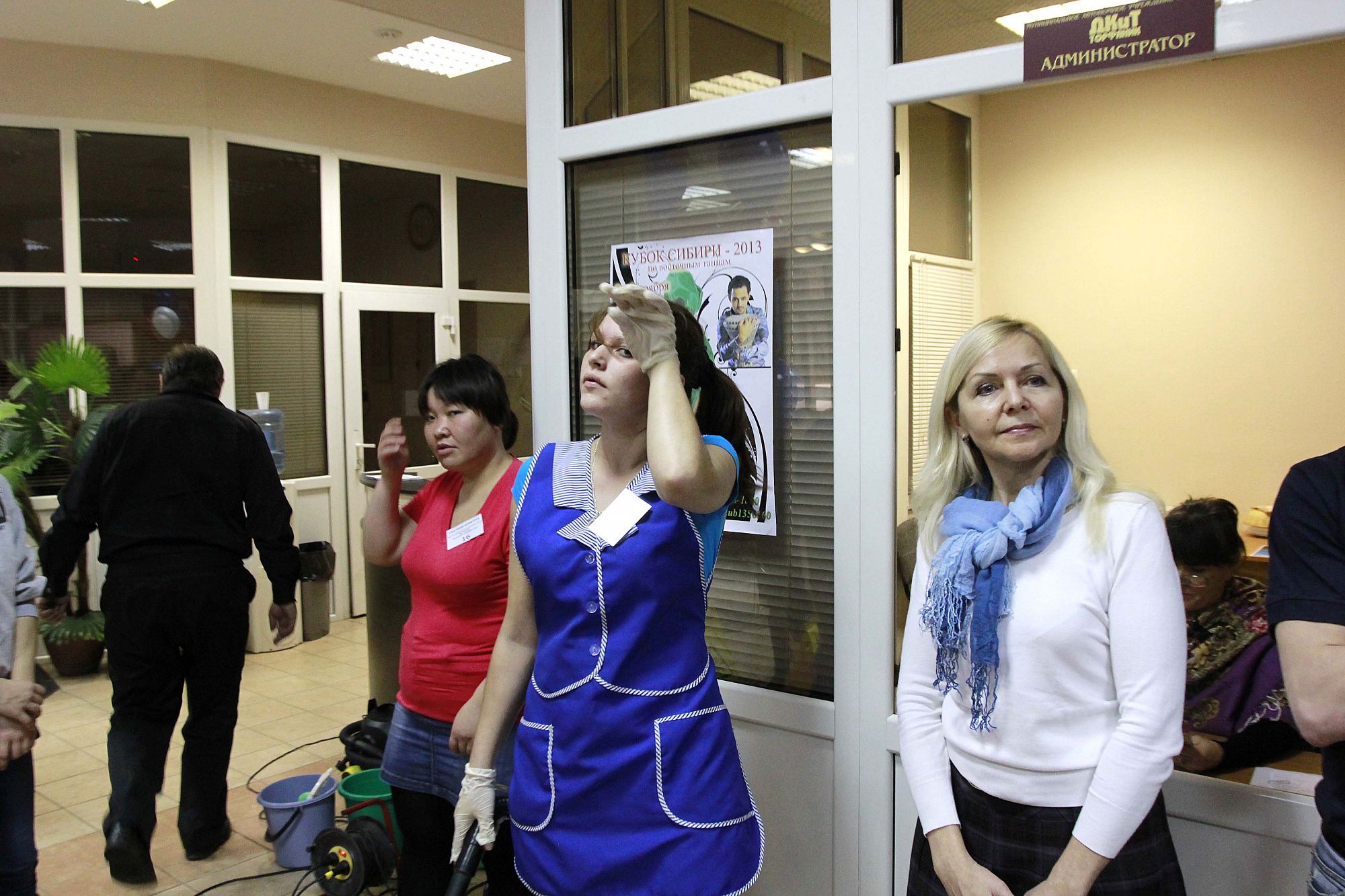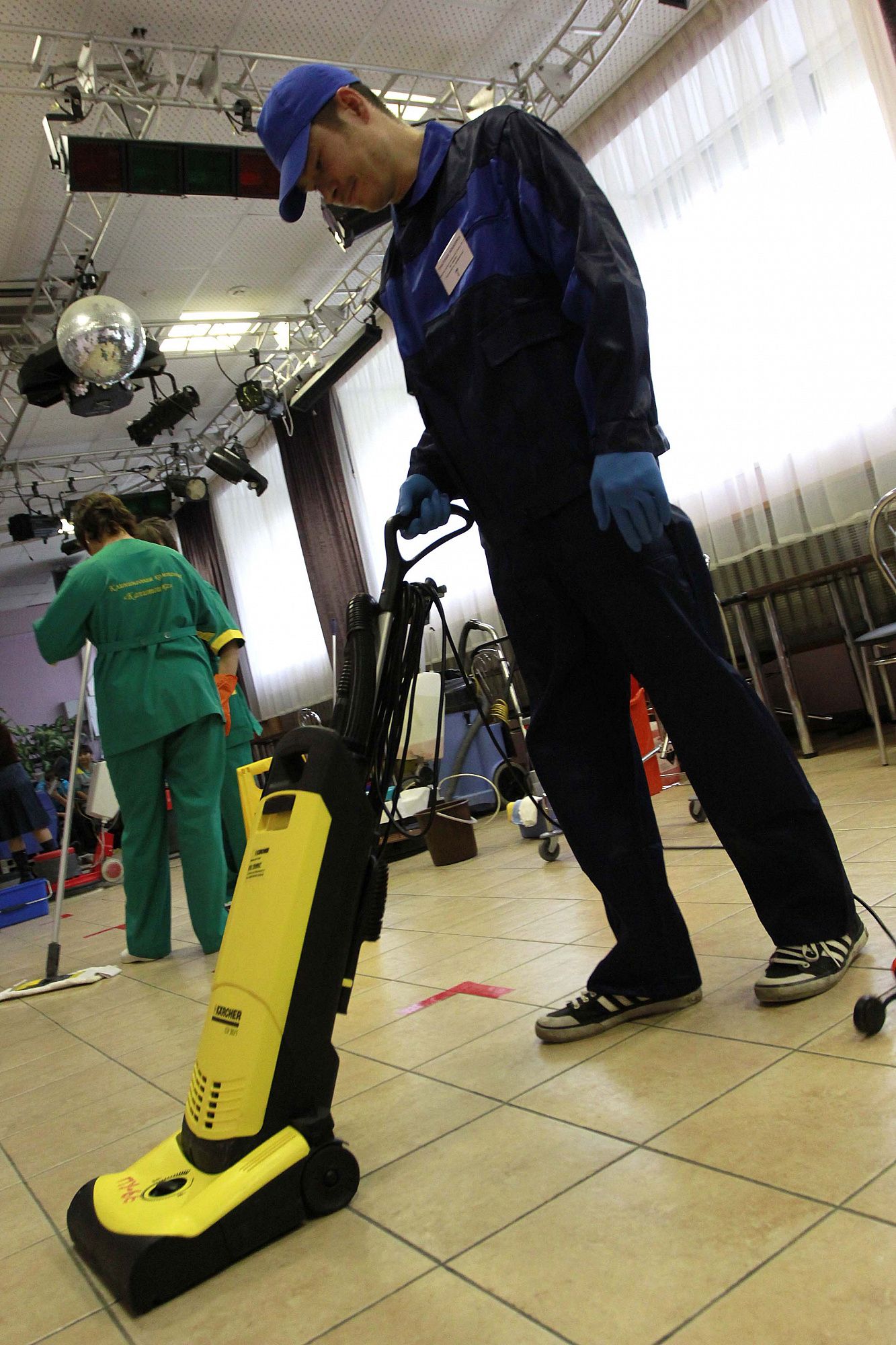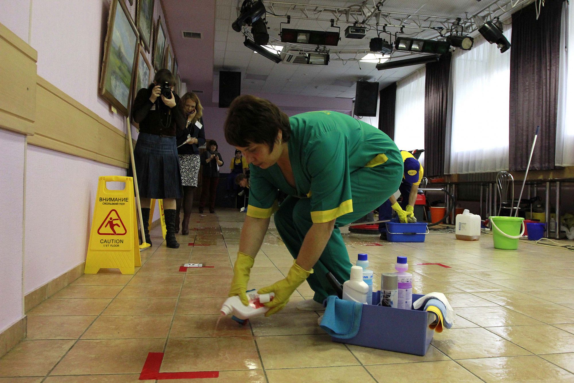 Сначала на арену чистоты вышли тяжело вооруженные уборщики, которые целых полчаса зачищали 10 секций плитки на полу дворца культуры. На этом этапе в бой пошло все оборудование, имевшееся в наличии компаний, отправивших своих мастеров на соревнование. Правда, кое-кому не повезло: из-за неисправной проводки одной участнице пришлось чистить плитку щеткой, по старинке. Затем электричество дали и она вернулась в борьбу уже на равных.