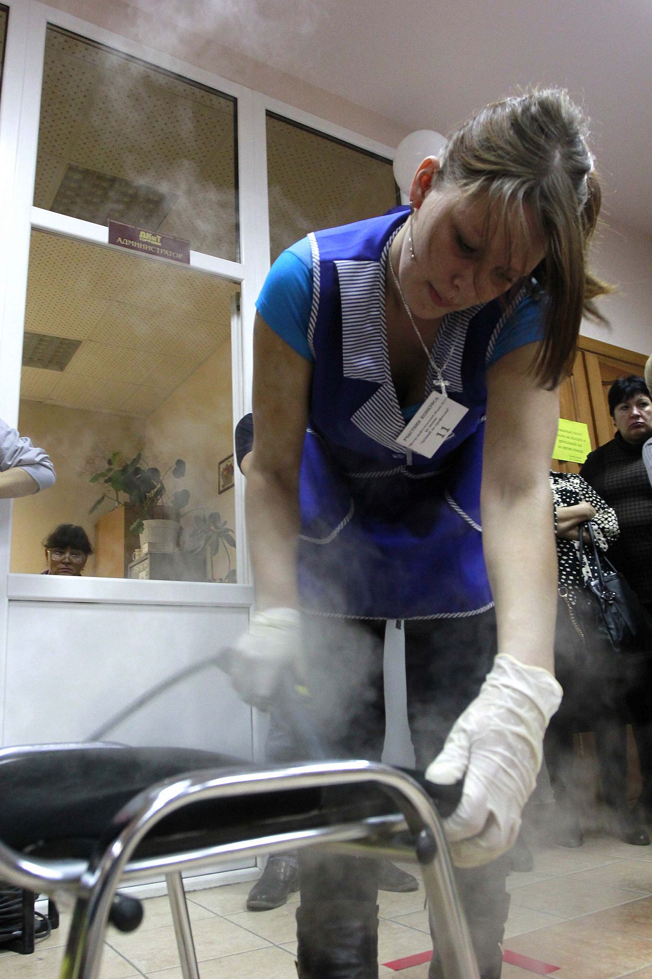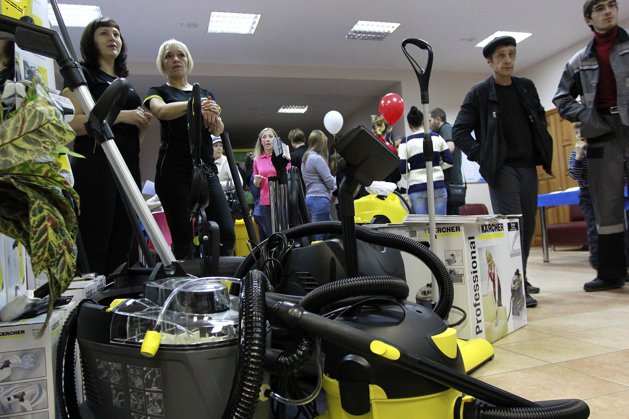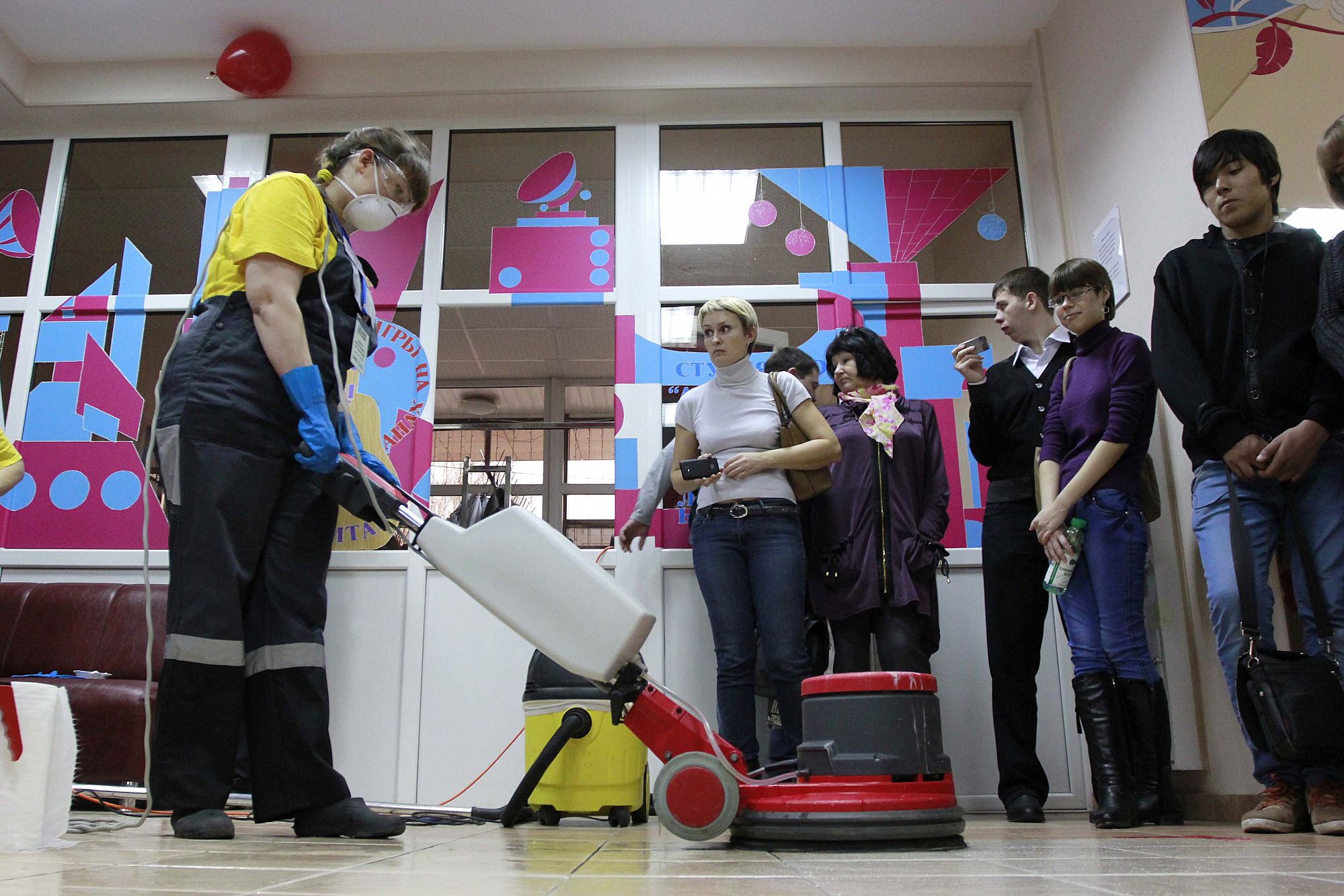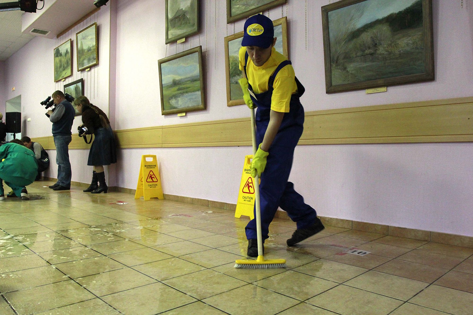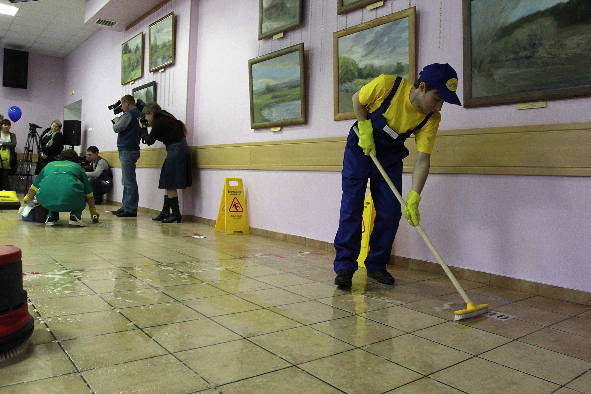 Сначала на арену чистоты вышли тяжело вооруженные уборщики, которые целых полчаса зачищали 10 секций плитки на полу дворца культуры. На этом этапе в бой пошло все оборудование, имевшееся в наличии компаний, отправивших своих мастеров на соревнование. Правда, кое-кому не повезло: из-за неисправной проводки одной участнице пришлось чистить плитку щеткой, по старинке. Затем электричество дали и она вернулась в борьбу уже на равных.