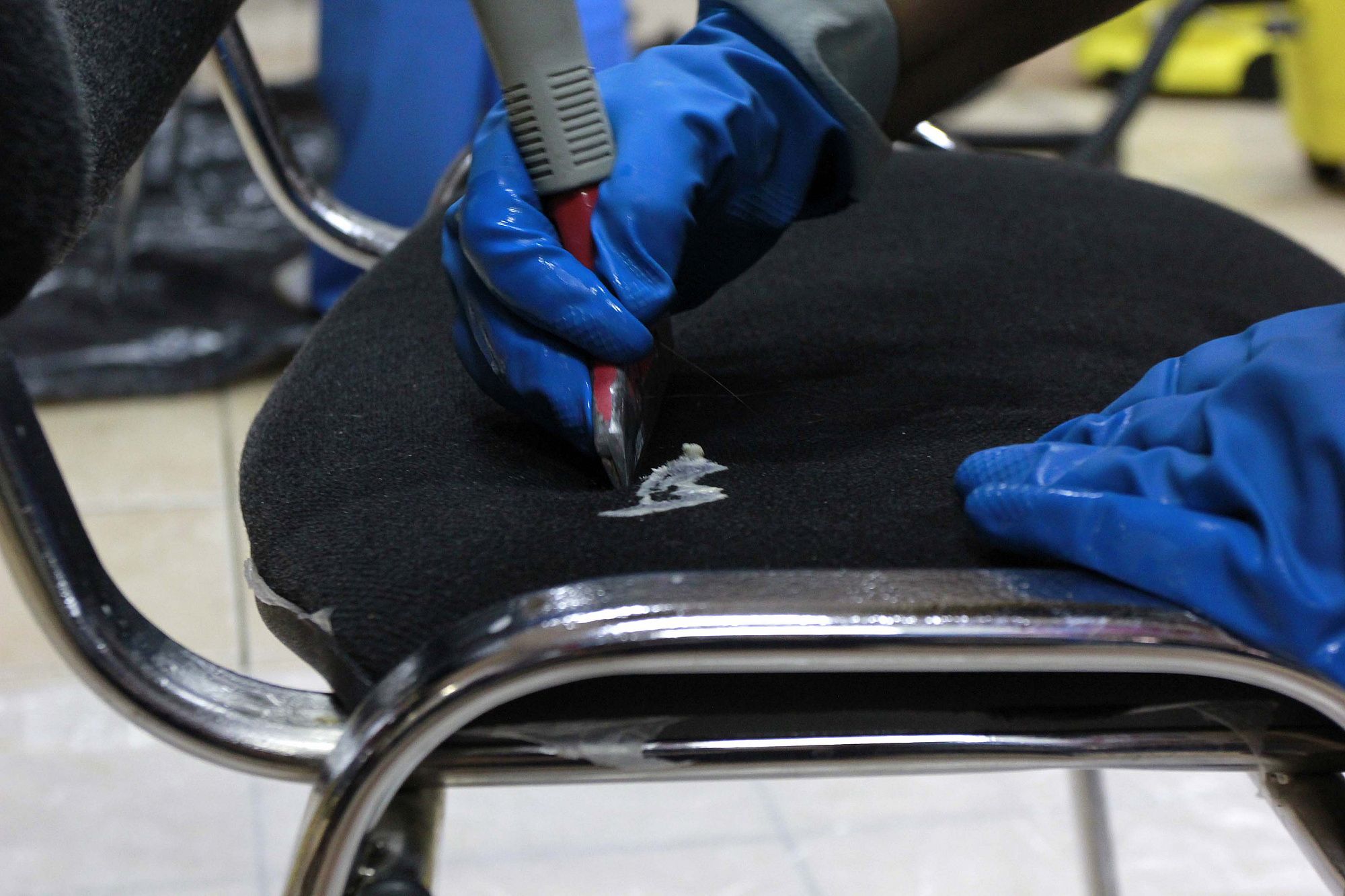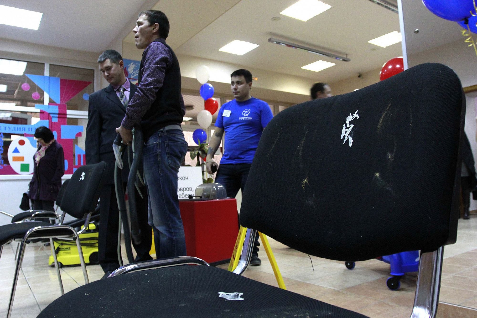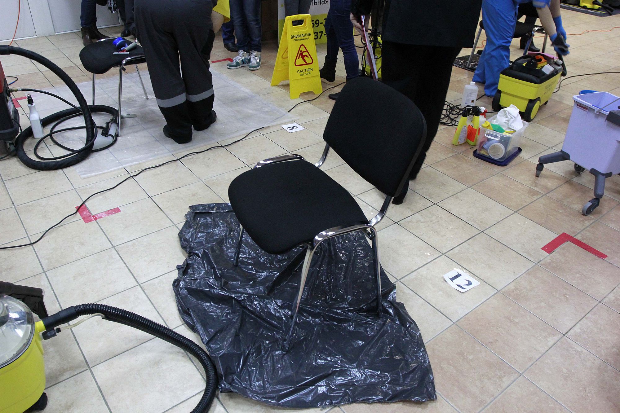 Вторым врагом клинеров на пути к победе стали офисные стулья, над которыми потрудились организаторы. Черные от природы стулья выглядели чуть ли не серыми от пыли, на них отчетливо виднелись следы ботинок, а традиционную жвачку прилепили не только на днище, но и на ткань.