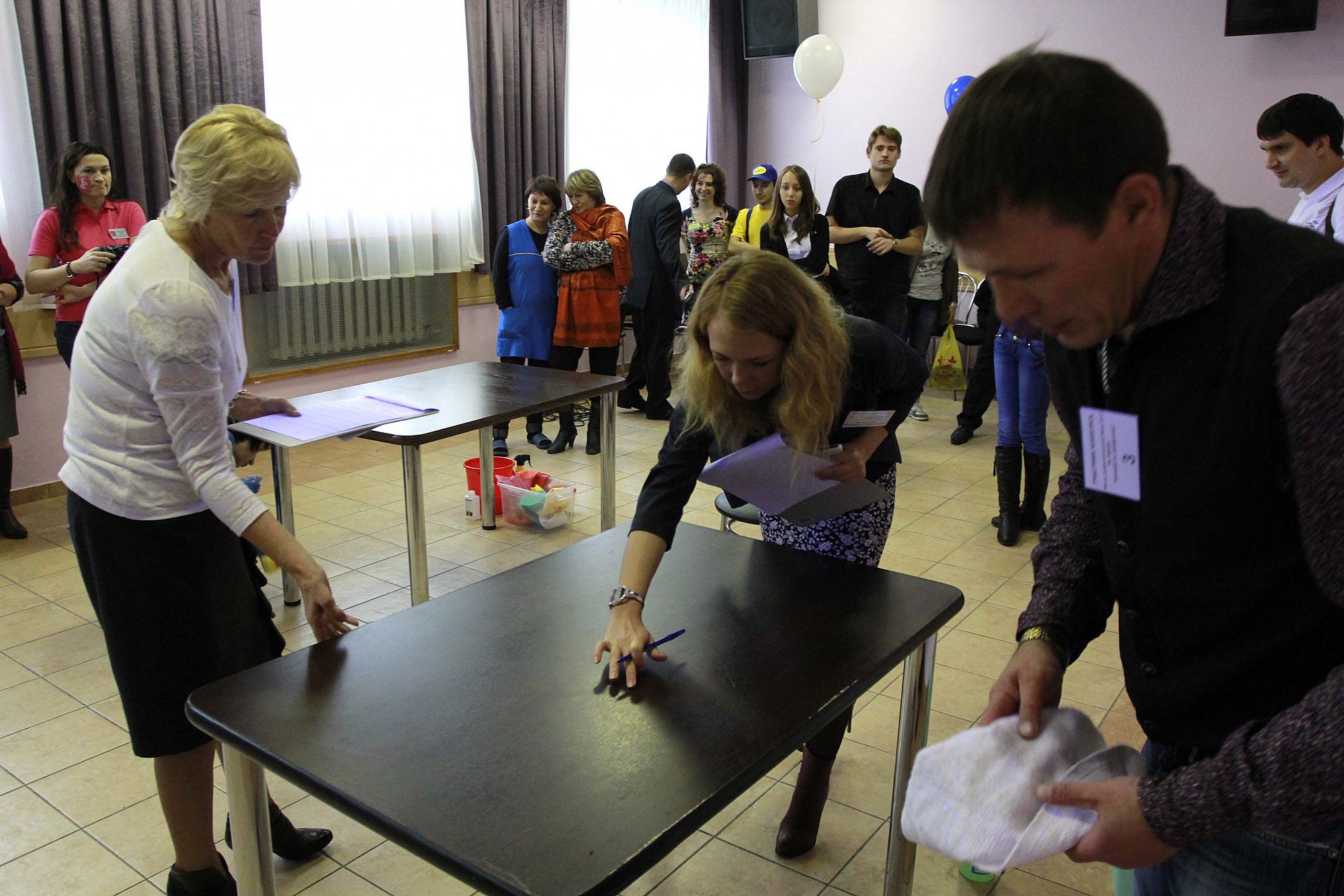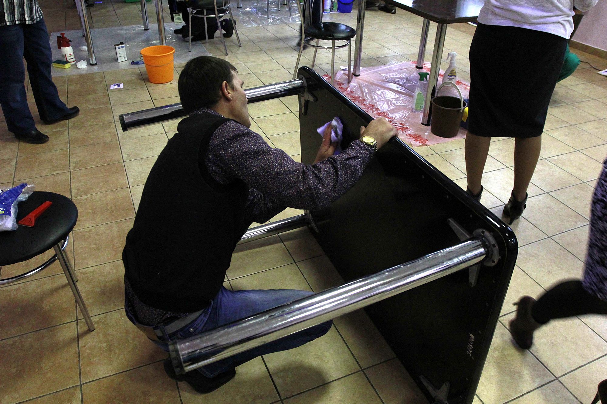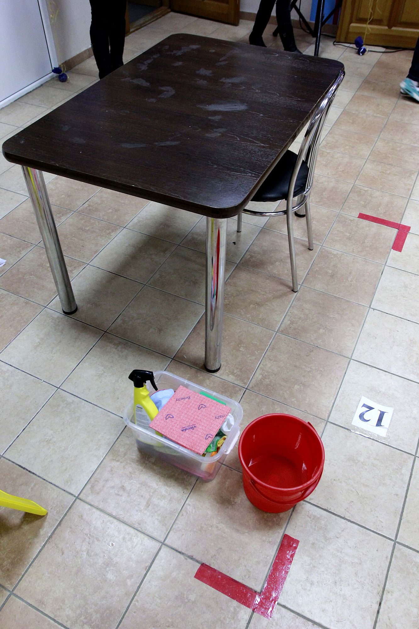 В конце участникам уже не удалось свалить работу на имевшееся в запасе оборудование, ведь столешницу как не крути, а мыть надо руками. Некоторые участницы решили не крутить грязный стол, а лезть под него.