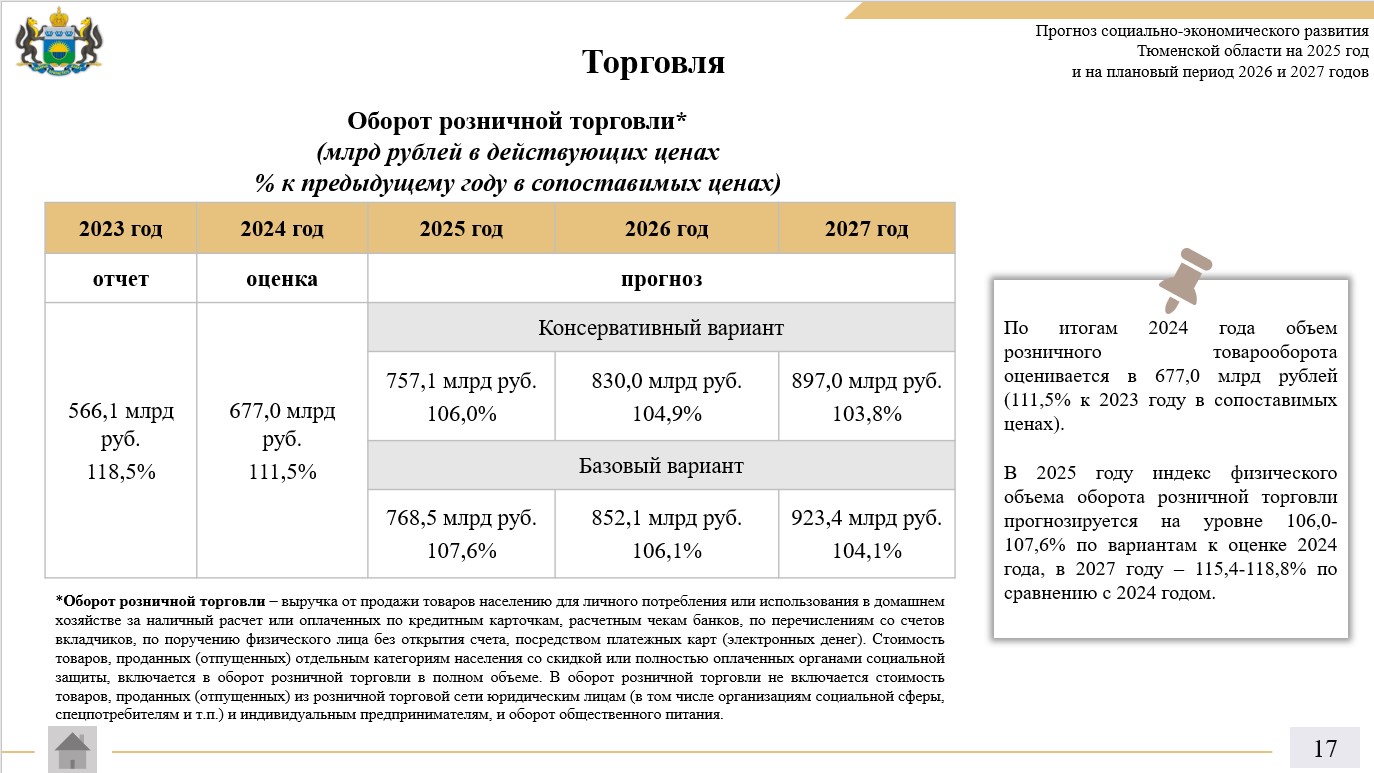 В Тюменской области также ожидается рост торгового оборота. По итогам 2024 года он может достигнуть 677 млрд рублей — на 11,5% больше, чем годом ранее. В 2027 году, по сравнению с 2024-м, он увеличится на 15,4%-18,8%, то есть до 897 млрд — 923,4 млрд рублей.