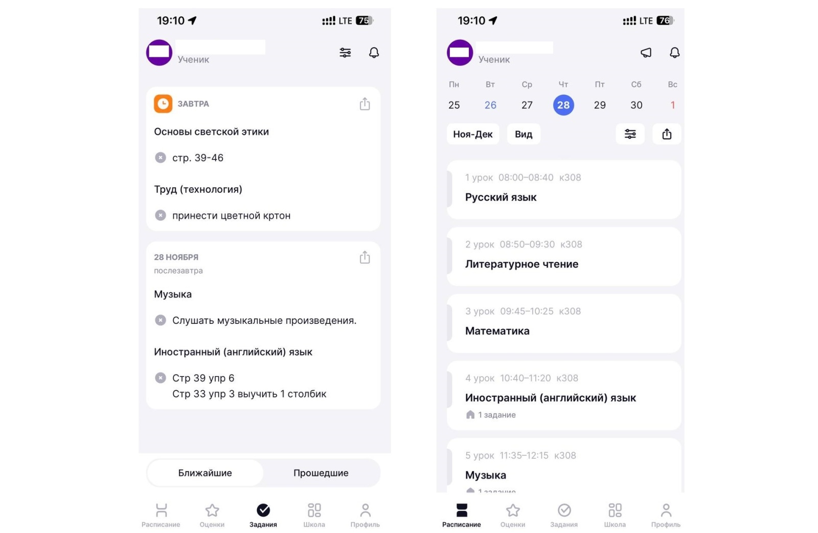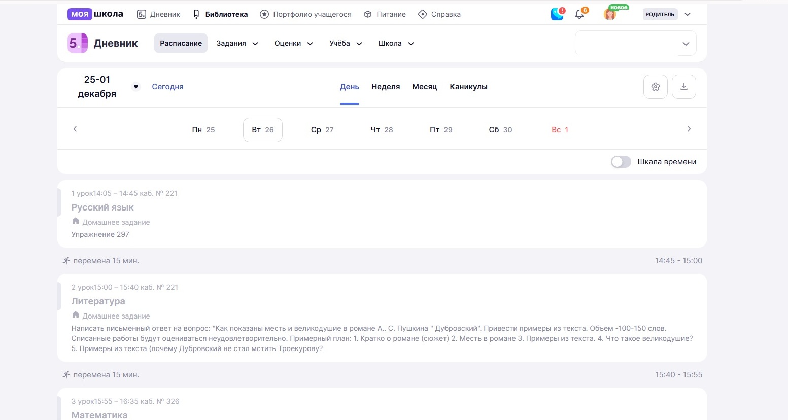 В «Дневнике» в подпункте «Расписание» будет представлена вся информация об уроках в виде временной шкалы — план на каждый из них, полученные оценки и задания на дом. В этом же разделе есть отдельный пункт «Домашние задания» — можно увидеть их целиком на весь день.