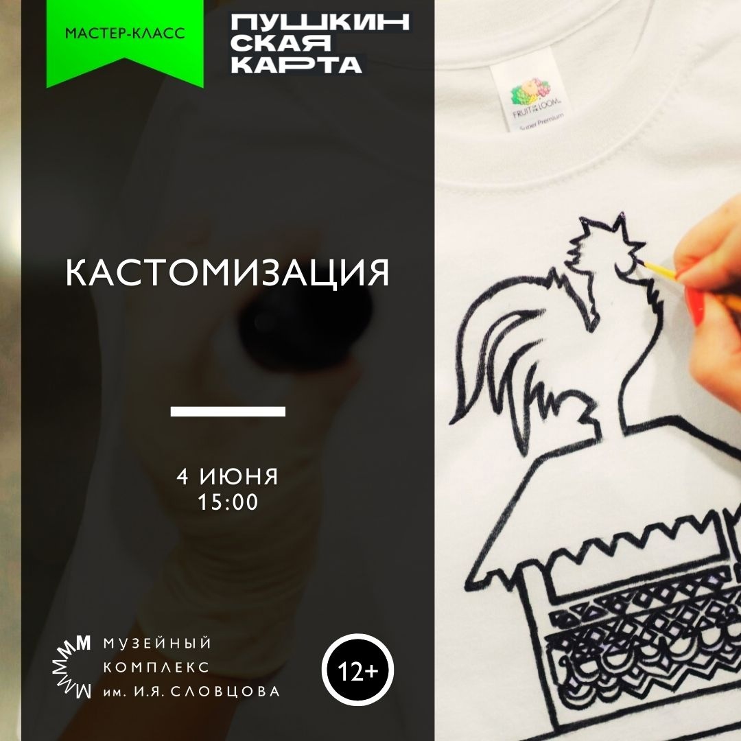 Кастомизация (в широком значении слова) — преображение той или иной вещи под конкретного человека. Посетители музея примут участие в необычном занятии — росписи по одежде. На мастер-класс обязательно нужно принести с собой любую вещь, которую вы хотите обновить и сделать лучше. Это может быть толстовка, футболка, юбка, платье и тому подобное. В ходе мастер-класса участники из старой вещи создадут совершенно новую и с уникальным дизайном. Купить билет. Купить билет по «Пушкинской карте».