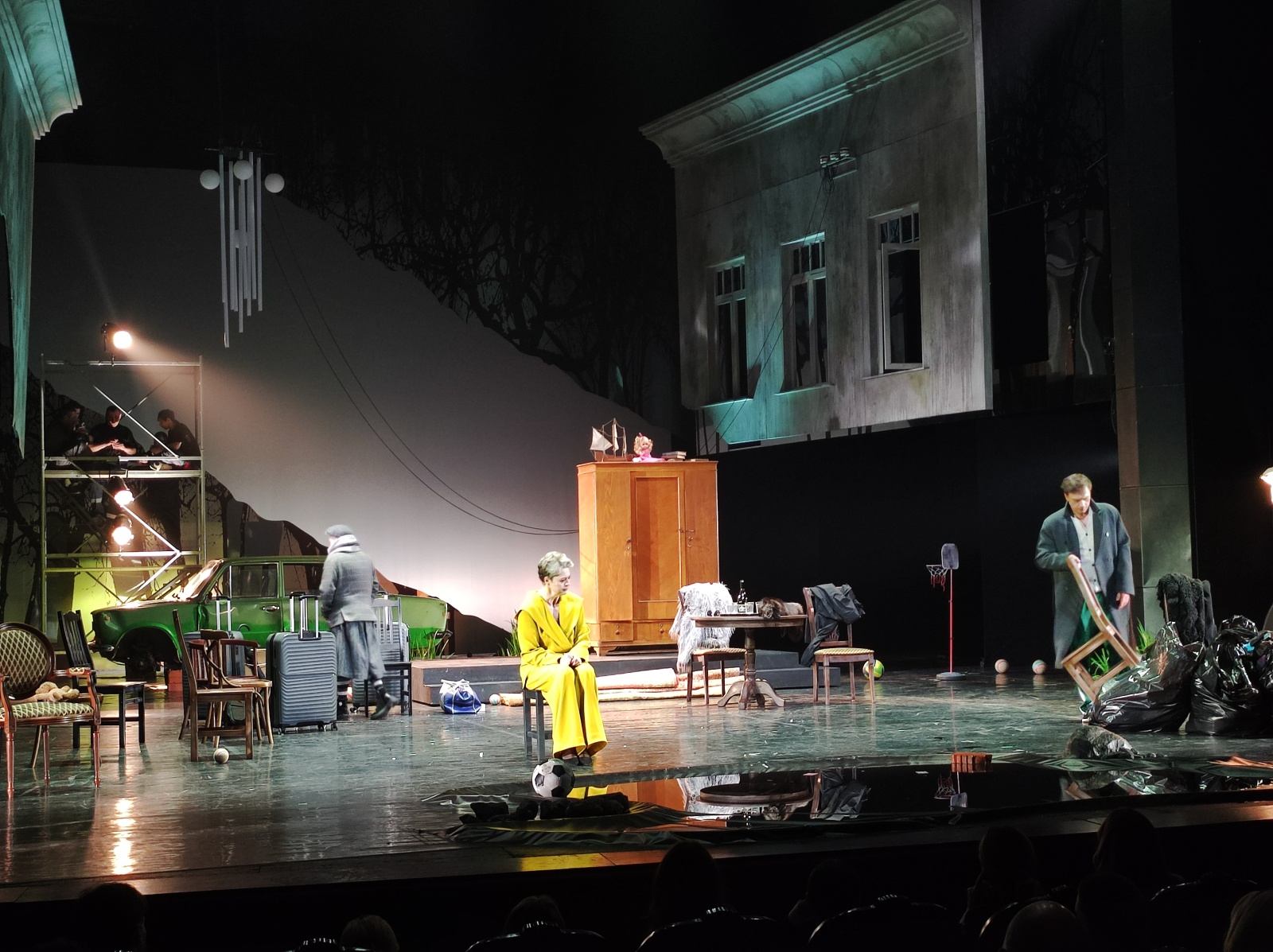 Свой неповторимый оттенок парадоксальности происходящему придавал и условно старый советский, калейдоскопический, дачный, антресольный антураж, изобретенный художником постановщиком Анваром Гумаровым и особенно — старые зеленые Жигули без колес, поставленные на кирпичах в глубине сцены. На этом фоне звучали и фразы о крепостном праве, отмененном на памяти ныне живущих героев. Сами артисты предполагали, что их, возможно, вновь упрекнут за несоответствие, как это было с их авангардной «Молодостью», однако решили рискнуть ради самоценной первоосновы и оставили контраст как он есть, на ваш суд.