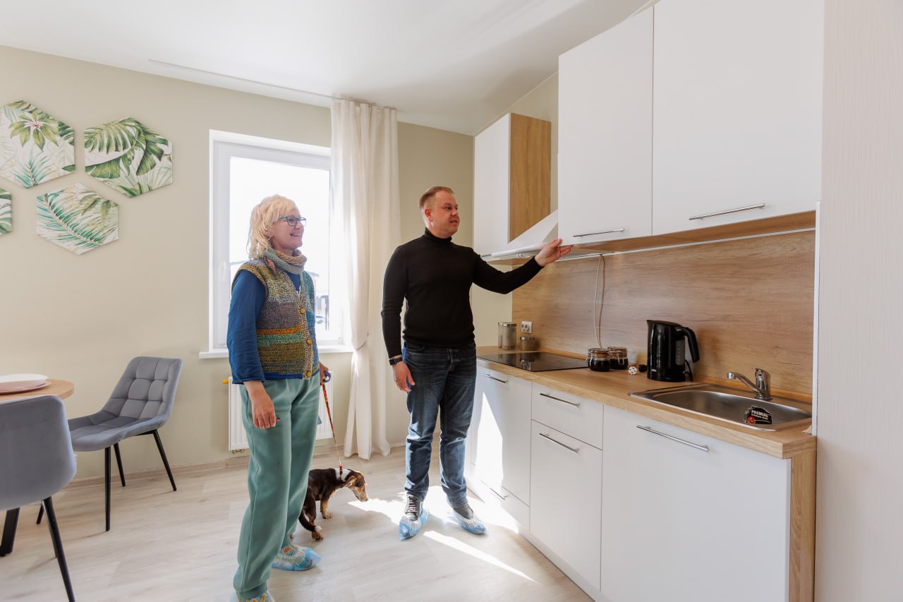 Такая отделка включает в себя финишную отделку стен обоями под покраску, натяжные потолки, напольное покрытие, межкомнатные двери, кухонный гарнитур с варочной панелью и мойкой, полностью оборудованные санузлы с мебелью и санфаянсом. В квартиры можно заезжать уже в день получения ключей и не тратить время и деньги на ремонтные работы! Нужно будет только расставить мебель!