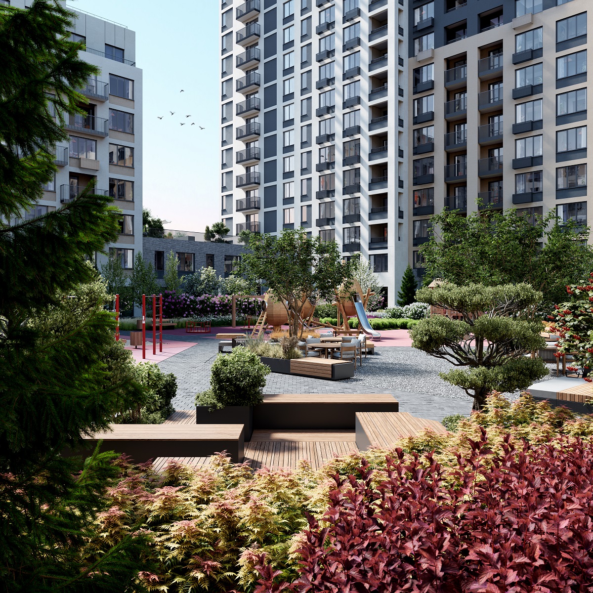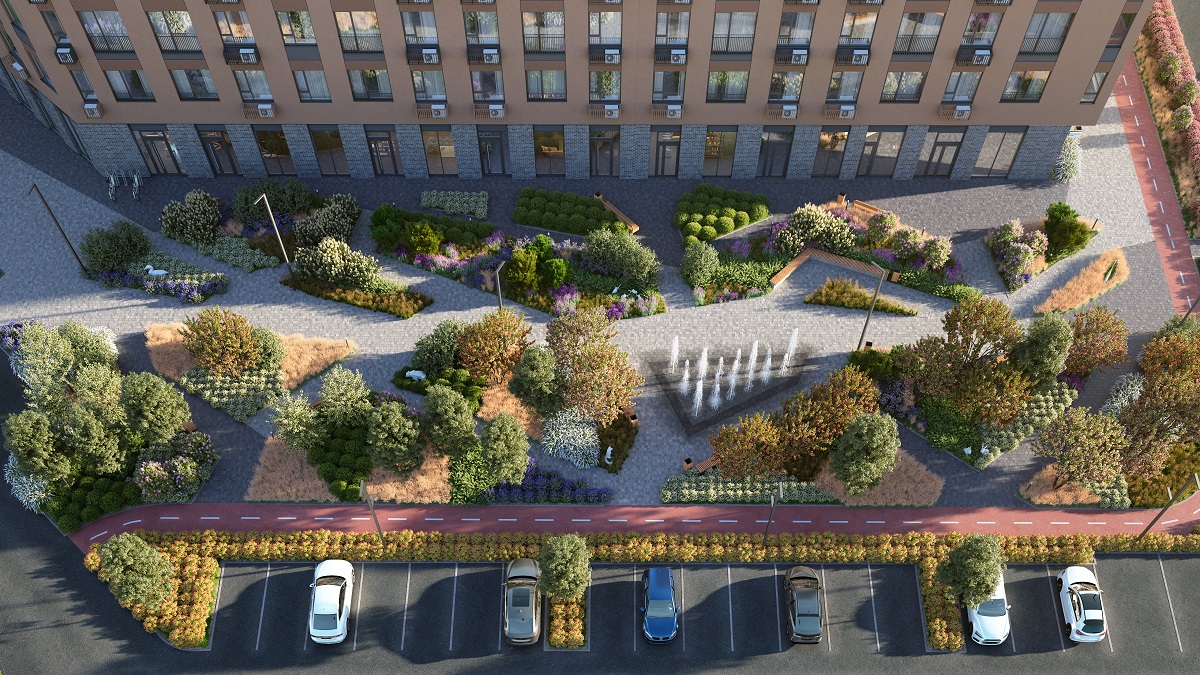 Многие уже знают об оригинальном концепте «дворов-оазисов» в этом проекте. Образ подкрепляется не только различными видами зелени во дворе, но и обустройством уютного сквера с фонтаном рядом с территорией кварталов, где приятно будет отдохнуть с книжкой или прогуляться вечером с коляской.