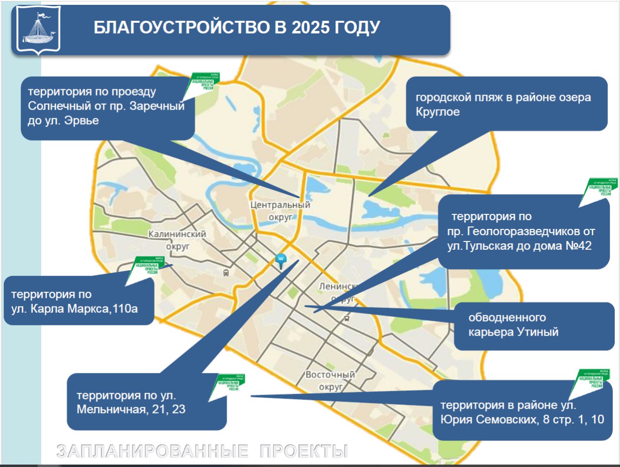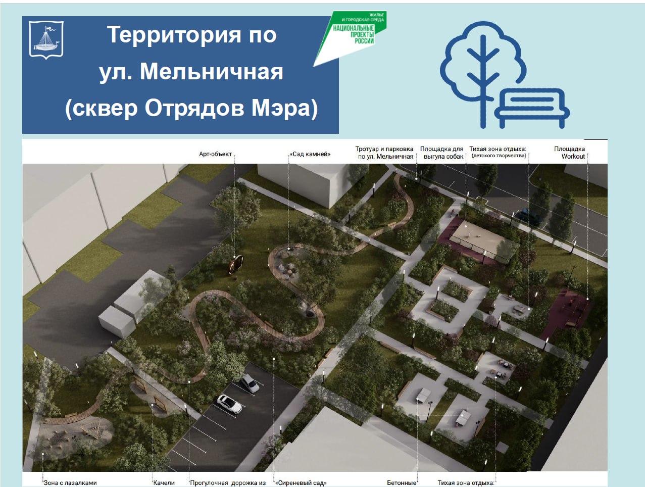 В наступившем году территория по ул. Юрия Семовских, 8, станет пространством, посвященным медикам. Общественное пространство на Мельничной, 21 будет вдохновлено «Отрядами мэра». Проезд Солнечный преобразится по мотивам сказки Петра Ершова. Также будут благоустроены территории на ул. Карла Маркса, 110 и проезд Геологоразведчиков.