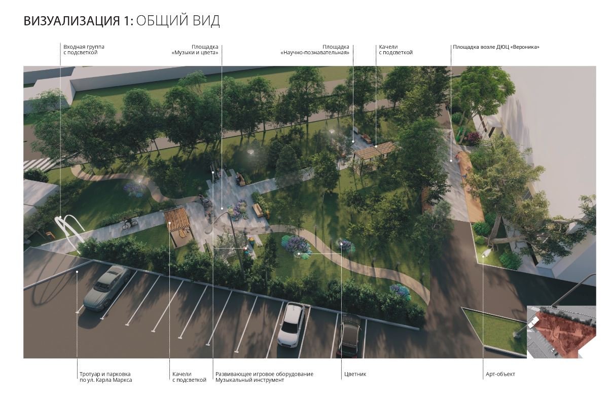 В первой концепции территорию предложено поделить на несколько функциональных зон, для детей установить интерактивное развивающее музыкальное оборудование, научно-образовательные тактильные панели, оборудовать детскую площадку. Также предлагается создать многофункциональное пространство со сценой для проведения концертов, выставок и тренировок.
