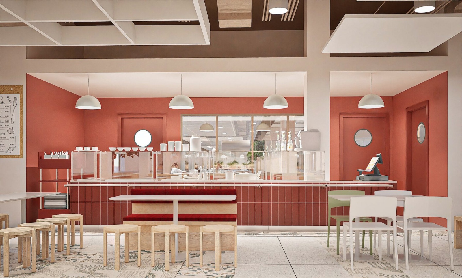 Столовая будет представлять собой не помещение с привычным рядом столов, а интересное пространство, пронизанное атмосферой домашнего уюта. В теплое время года отсюда можно будет попасть на террасу для отдыха.