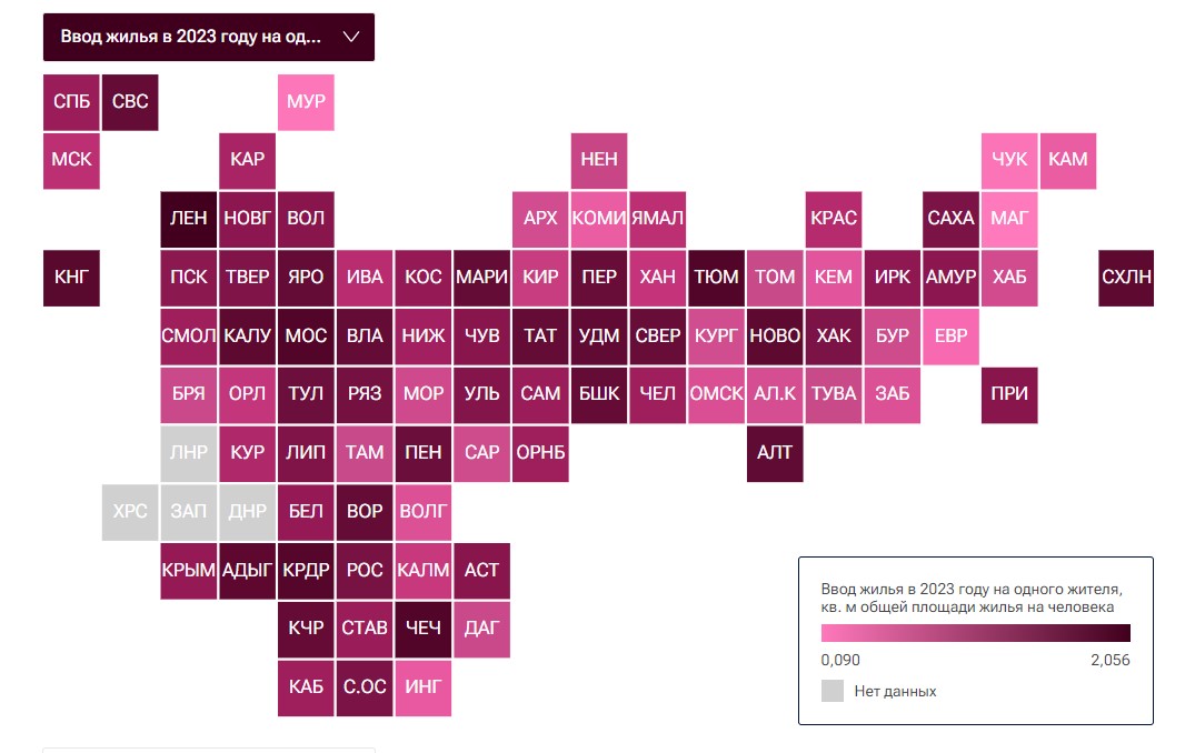 Лидирует в списке Ленинградская область, где ввод жилья составил 2,056 кв. метра на человека. На третьем месте — Чеченская республика с показателем 1,501 кв. метра.