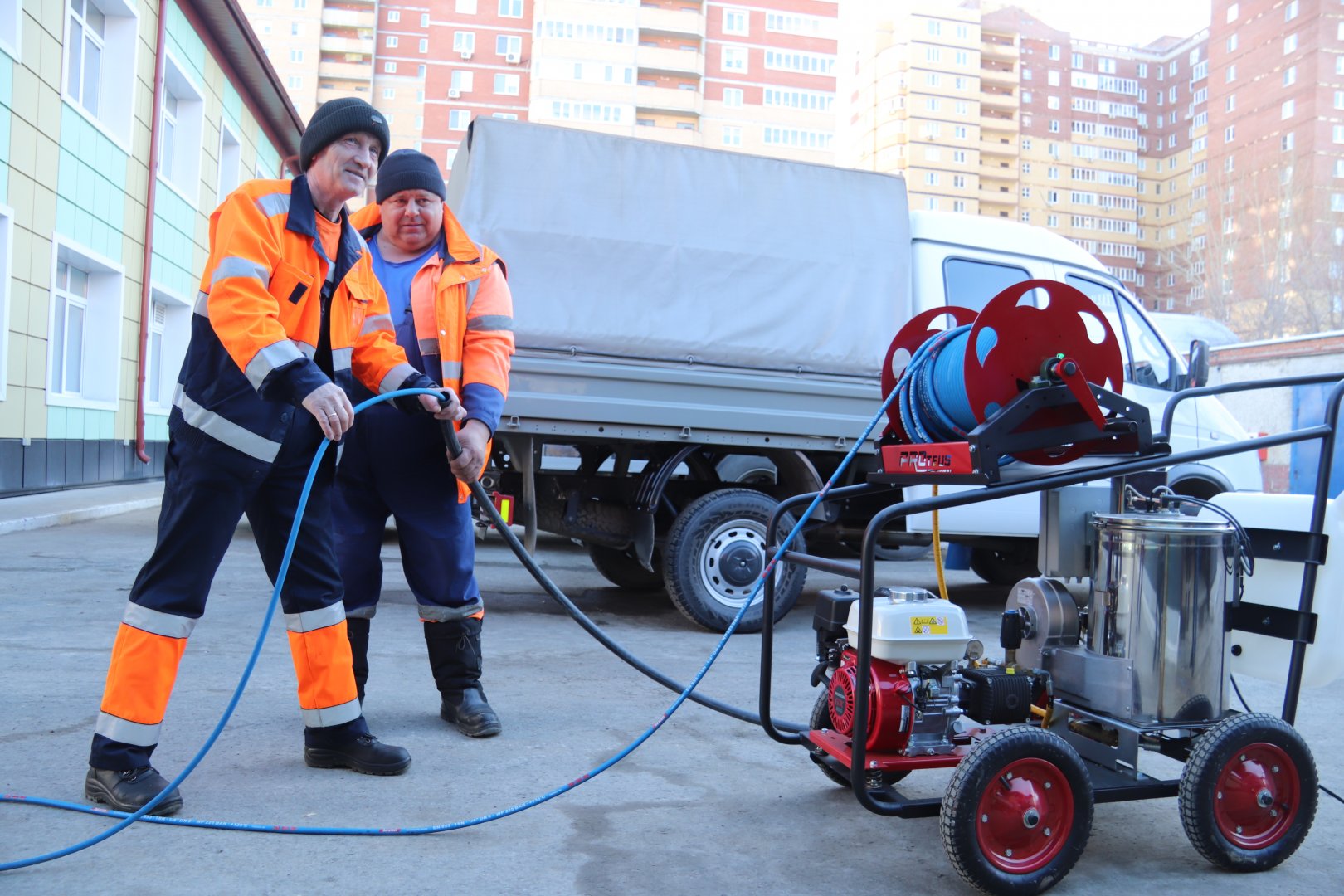 «Для отогрева трубопроводов мы традиционно используем автомобили, оборудованные передвижными паровыми установками. Они не всегда удобны для работы на трубах небольшого диаметра. Изучив рынок и опыт коллег из других водоканалов, приобрели эту мобильную установку. Она способна отогревать трубы паром и горячей водой, а также использоваться для промывки сетей диаметром от 30 до 200 мм», — рассказал начальник цеха эксплуатации сетей водоснабжения и повысительных насосных станций «Росводоканал Тюмень» Владимир Шааб.