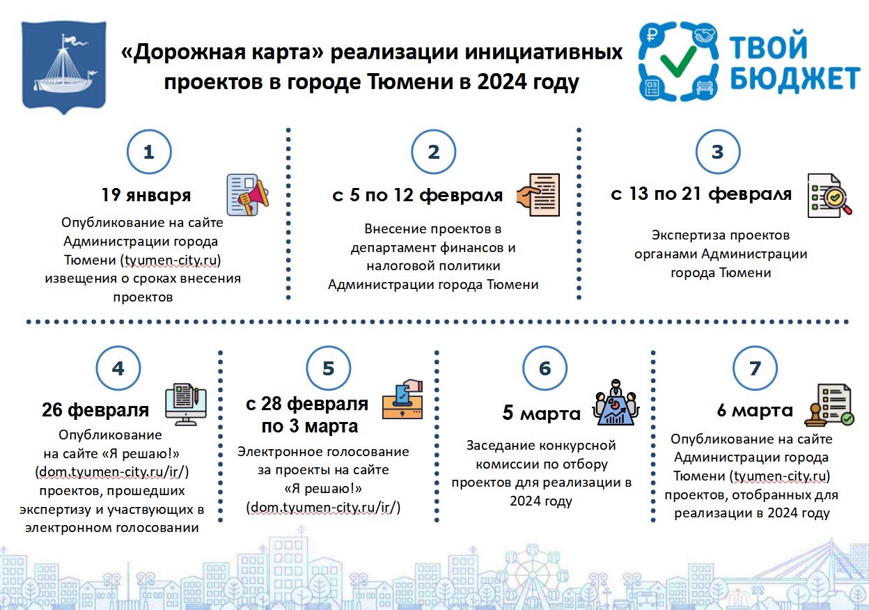 Проекты принимают с 5 по 12 февраля в городском департаменте финансов и налоговой политики: ул. Первомайская, 20, каб. 616а; tvoybudget@tyumen-city.ru.