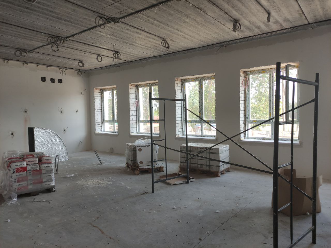На 100% выполнены работы, связанные с фундаментом, на 98% - по коробке здания, кирпичной кладке наружных и внутренних стен, заполнению оконных проемов.