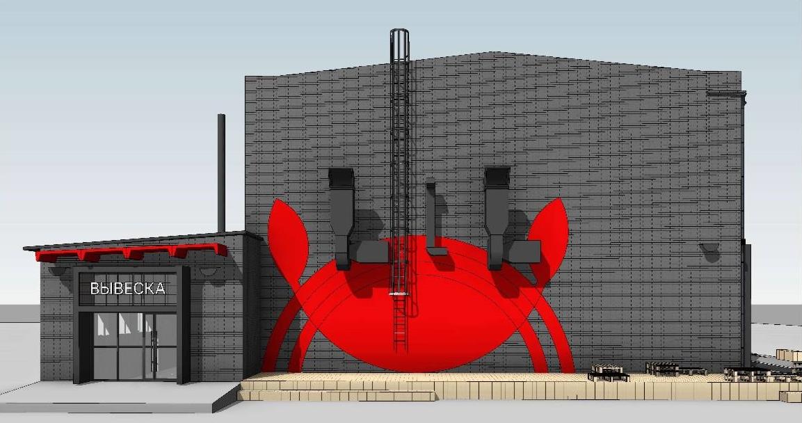 «У этого объекта много внешних коммуникаций, проводов и труб, выходящих из фасада. Две трубы напомнили нам глаза краба — они массивные и выступают за фасад. Хотим их сохранить, а вокруг дорисовать тело краба. Для этого пригласим местных граффити-художников, чтобы поддержать стрит-арт, который уже есть на здании», — рассказал Никита Маликов.