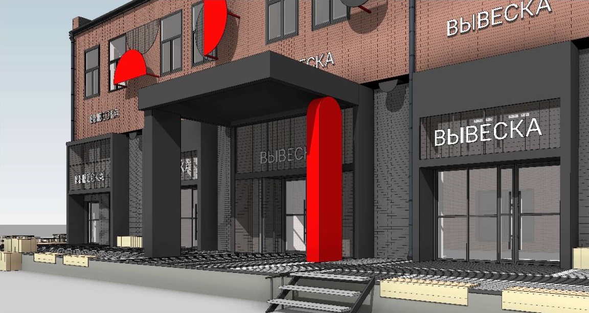 Дополнят образ большие стеклянные витрины в графитовых переплетах. В зонах с загрузкой будут реконструированы козырьки. Появятся новые конструктивные элементы в виде колонн и кровли. Красный будет цветовым акцентом. Складская часть станет торговым променадом, который завершит зона отдыха с деревянной террасой и изображением краба.