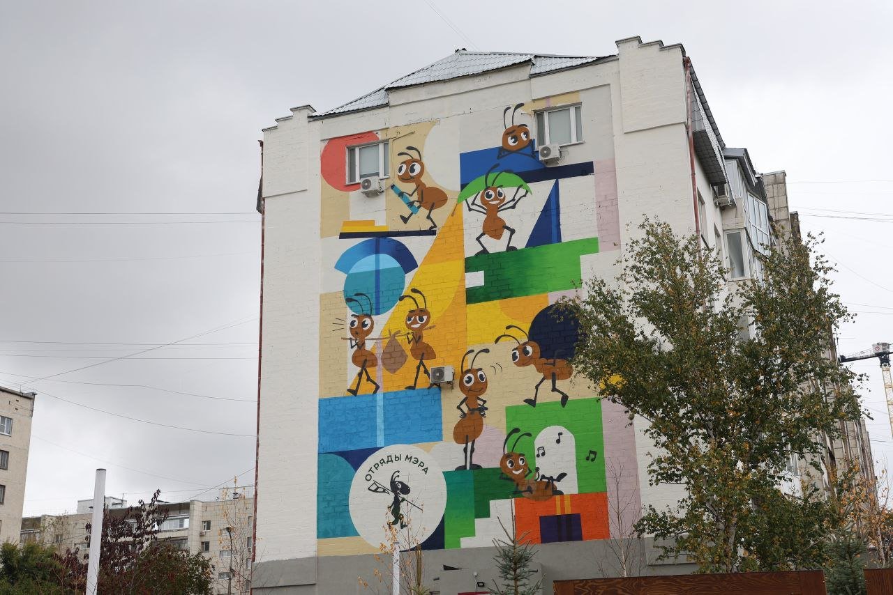 Мурал с муравьями расположен на стене здания на ул. Холодильной, 84/2, сообщает комитет по связям с общественностью и СМИ администрации города.