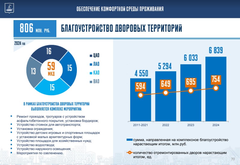 В Тюмени в 2024 году планируют благоустроить 59 дворов: по 15 в Ленинском и Калининском округах, 16 — в Центральном, 13 — в Восточном. Как выяснил «Вслух.ру», по итогам данных работ число отремонтированных дворовых территорий вырастет до 754, общая сумма финансирования превысит 6,8 млрд рублей.