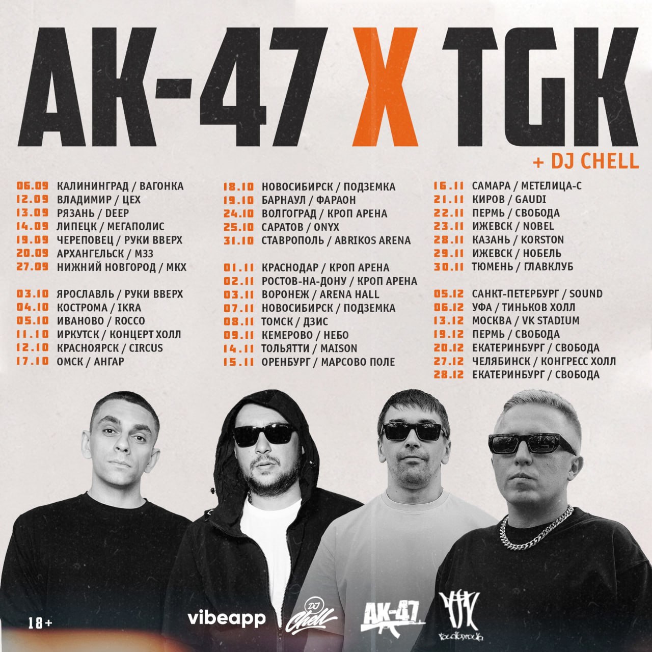 Этой осенью легенды российского хип-хопа — группы АК-47 и TGK — отправились в масштабный тур по России. Витя АК, Максим АК, Jahmal и VibeTGK выступят с программой «старой школы», объединяющей города от Калининграда до Иркутска.