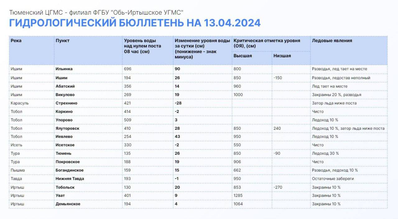 По данным на 13 апреля, неблагоприятных и опасных явлений на реках Тюменской области нет. Об этом сообщает информационный центр регионального правительства.