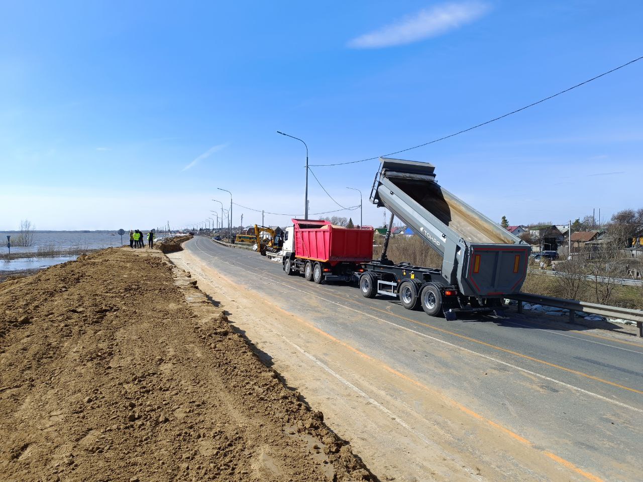 Со стороны большой воды продолжают расширять земляной вал. Это помогает сдерживать воду, а также снизить фильтрационную способность щебеночного слоя дороги. Окраину насыпи укрепляют пленкой и мешками, которые дополнительно выступают в качестве волнорезов, уменьшая нагрузку на насыпь.