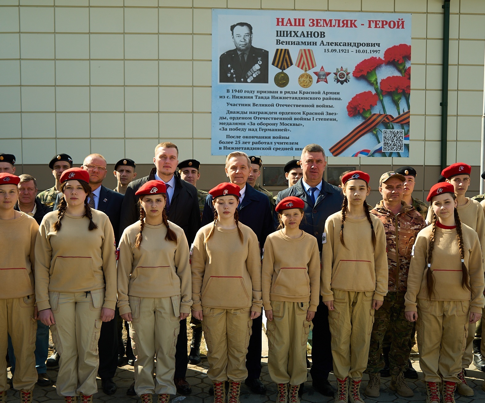На фасаде школы в Нижней Тавде размещен баннер с портретом участника Великой Отечественной войны, учителя школы Вениамина Шиханова в рамках проекта «Единой России» и Минпросвещения «Лица Героев».