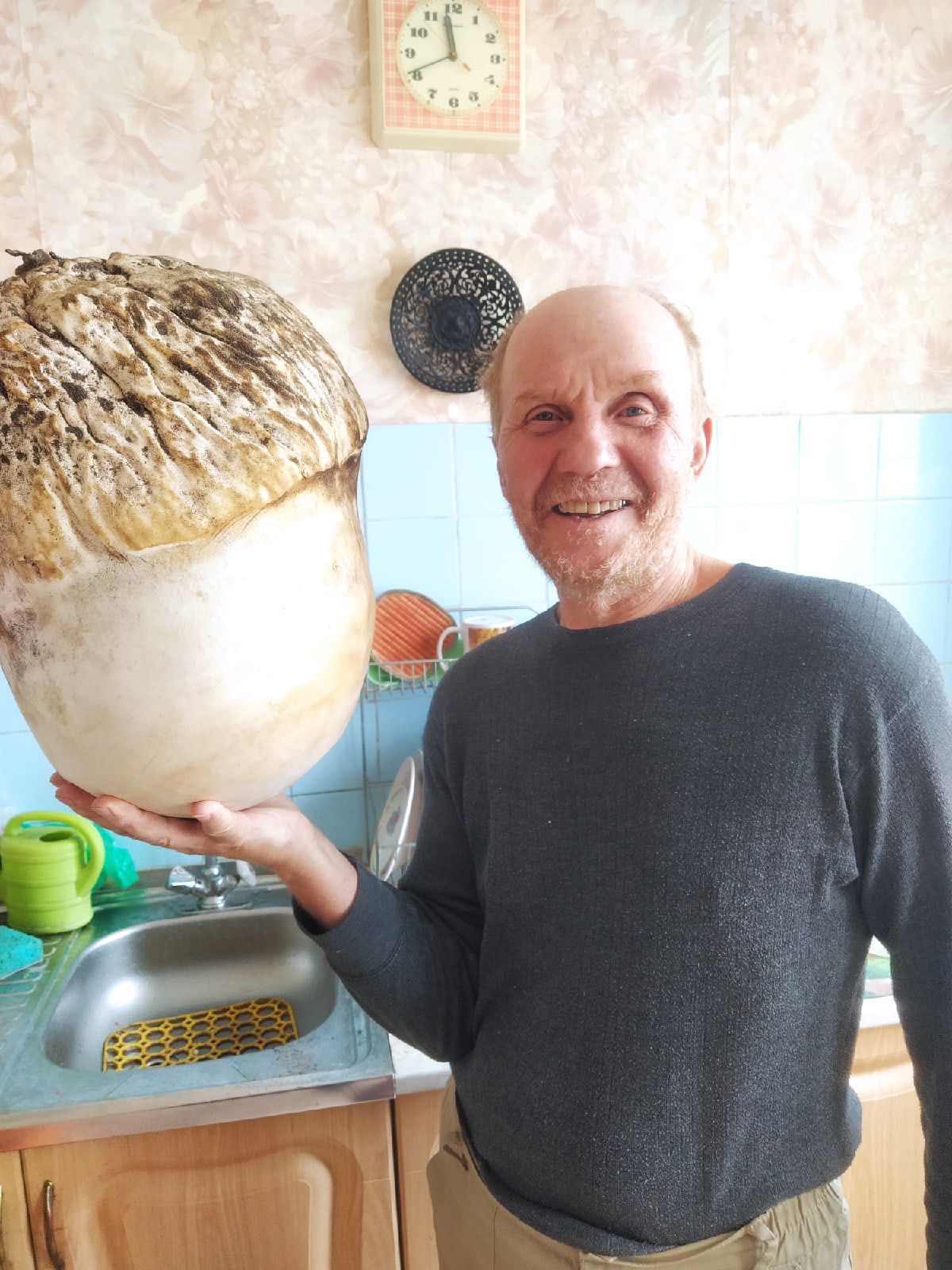 Напомним, первый дождевик весил 3,8 кг. Виталий уточнил, что по вкусу гигантский дождевик такой же, как обычные грибы, только с куриным оттенком.