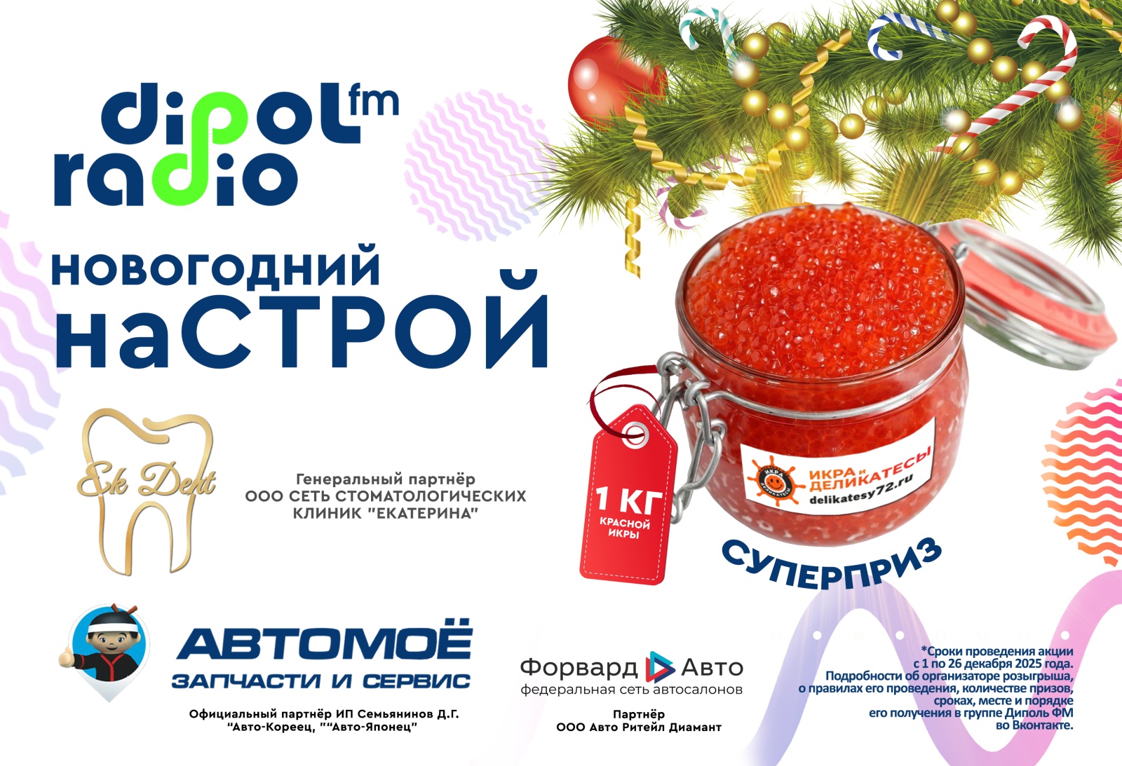 Розыгрыши призов от партнеров проекта проходят ежедневно в эфире шоу «Контора» или «Попутчики». Розыгрыш суперприза состоится 26 декабря в 09:30 в прямом эфире шоу «Контора» на Dipol FM.