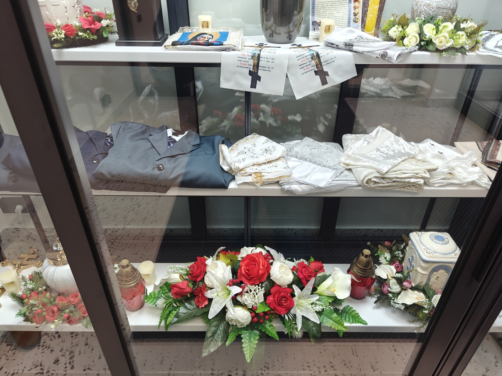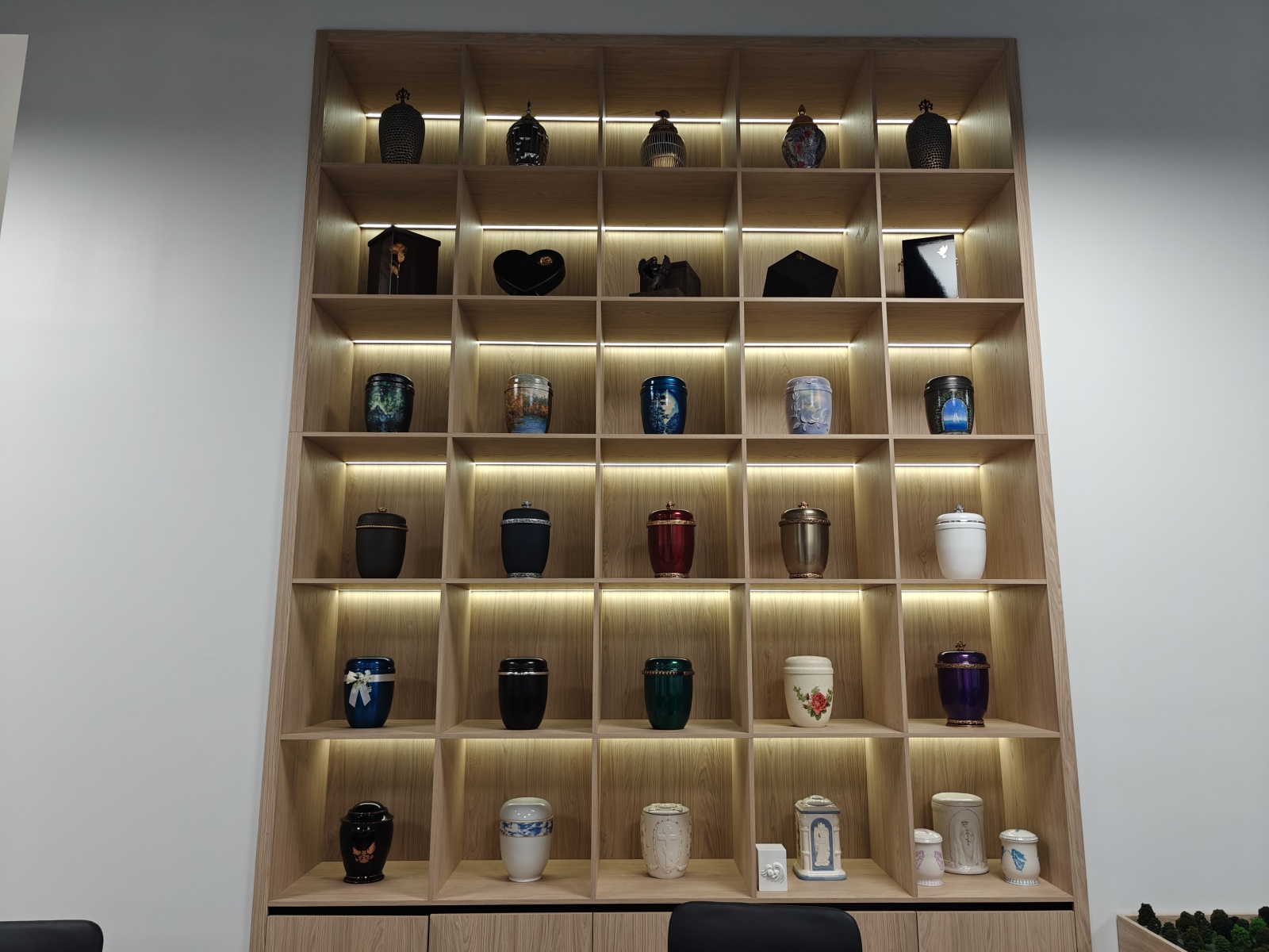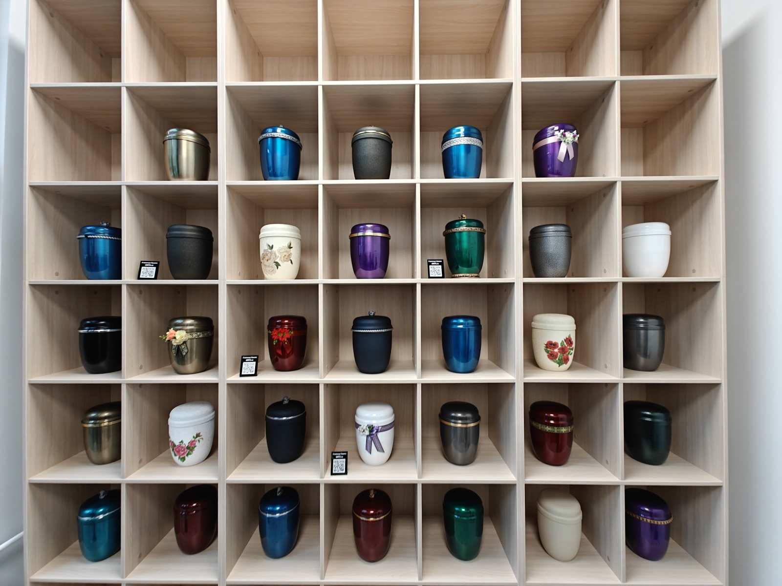 В этом же зале представлены макеты погребальных урн. Есть классические, в виде небольшой вазочки, есть скромные, недорогие, а есть декоративные, вырезанные из дорогого дерева, необычной формы. Например, при желании можно приобрести урну в форме траурного черного сердца или шкатулки с резным плачущим ангелом. Конечно, это варианты не для погребения. Дорогие и резные урны покупают для домашнего хранения, когда после кремации планируют сохранить прах близкого рядом с собой. В комнатке рядом представлены сопутствующие товары: цветы, религиозная атрибутика.