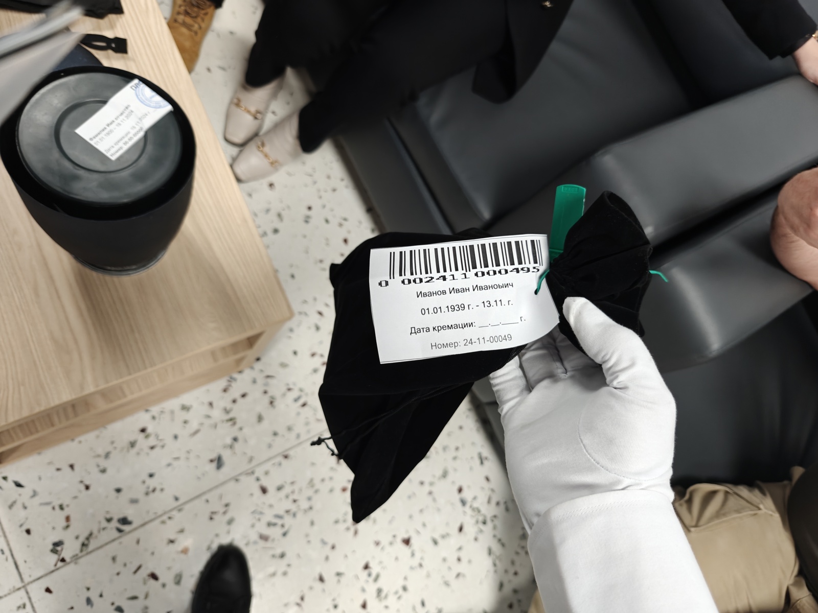 В графе «Фамилия Имя Отчество» было написано «Фамилия Имя Отчество», но нашего подопытного мы нарекли Иван Иванычем — именно это имя было выведено на мониторе в коридоре перед залом прощания. Сотрудники крематория, одетые в специальную черно-белую форму, подняли крышку, чтобы убедиться — гроб пустой, не волнуйтесь. После условного прощания Иван Иваныча снова закрыли и увезли к печам, где благополучно и кремировали.