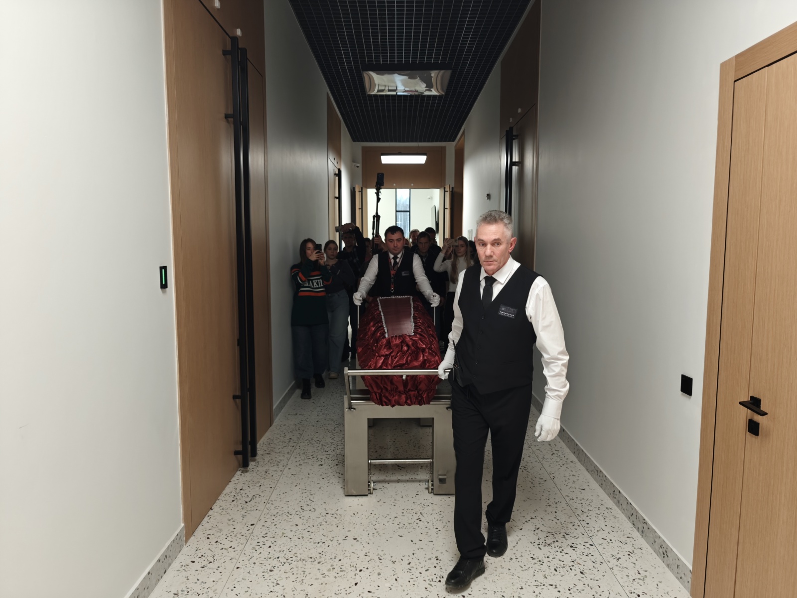 В камере гробы стоят полностью закрытыми, ожидают приезда близких для прощания, ведь записываются на церемонию заранее и на определенное время. После этого гроб с телом выкатывают в зал прощания. Перед входом в каждый из трех залов висит отдельный монитор, на котором появляется ФИО покойного, его даты рождения и смерти. Двери открываются, родные заходят.