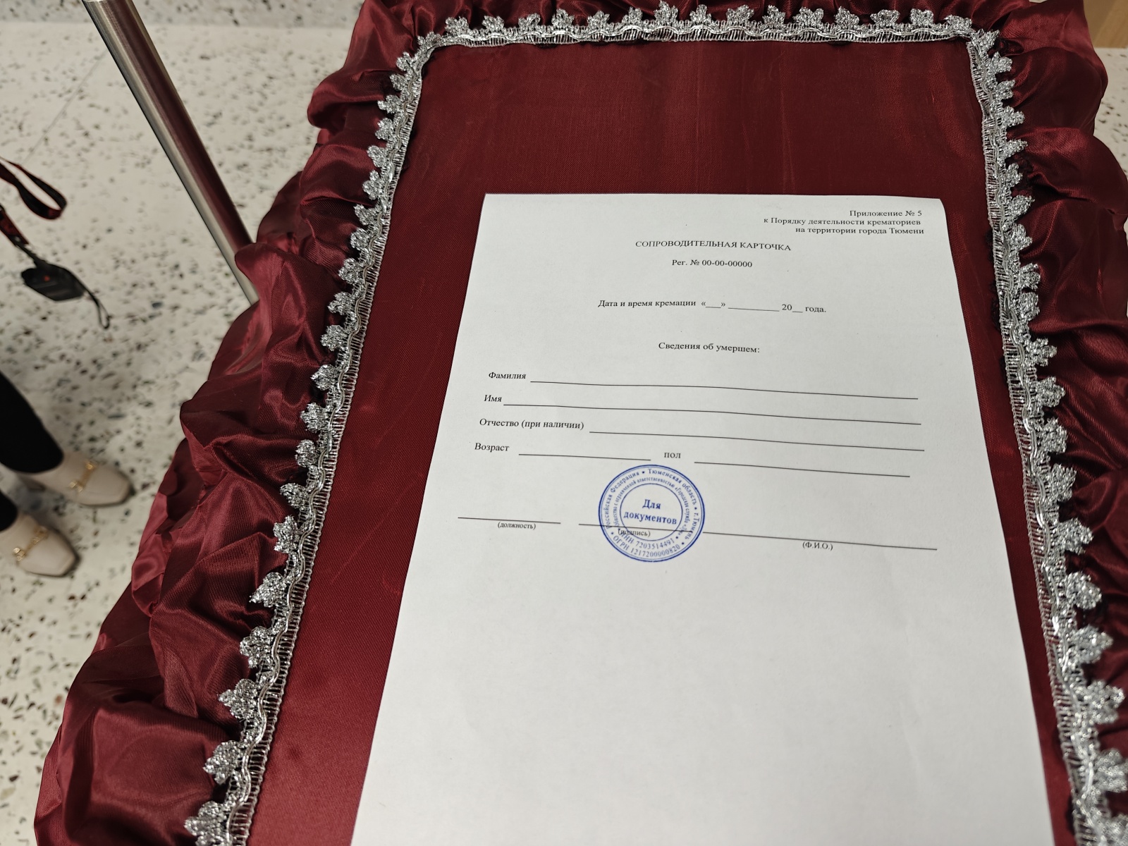 Процесс отправки в последний путь нам продемонстрировали наглядно. Нет, мы не стали цинично вклиниваться в похоронную процессию. Для демонстрации работники крематория выделили специальный гроб, который внесли в зал прощания во время пресс-тура. Гроб был пустой, но оформлен как полагается: наверху лежал бланк сопроводительной карточки, сбоку была прикреплена бумажка с тем самым штрих-кодом, уникальным для каждого усопшего.