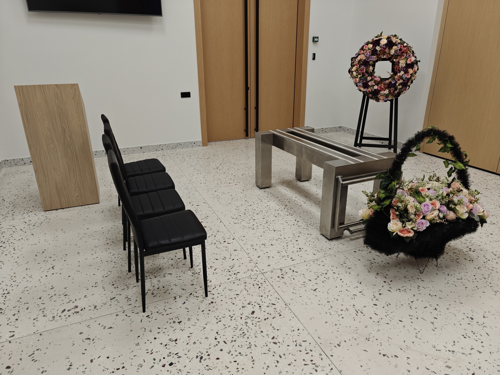 Немного в стороне от гроба на стене висит монитор: по нему можно пустить во время прощания слайды с изображением покойного или поставить какую-нибудь печальную музыку. Под монитором — небольшая кафедра с микрофоном. Каждый желающий имеет возможность подойти, сказать прощальную речь. Предусмотрено даже место для цветов и небольших венков: стол неподалеку от гроба. Он обит черной тканью, исполнен в траурном сдержанном стиле.Этот зал — практически последнее место, где можно попрощаться с усопшим. Большинство провожающих его больше не увидит.