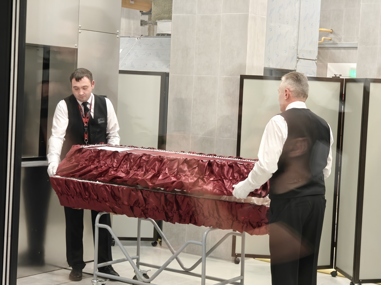 Из морга тело привозят на катафалке на территорию крематория. Машина подъезжает с тыльной стороны здания, вдали от любопытных взглядов. Но даже если случайно забредший прохожий увидит транспортировку гроба, никакой тайны перед ним не откроется: катафалк заезжает задом в специальный бокс. В нем работники выгружают гроб с телом и помещают его в камеру холодильника, расположенную тут же. Холодильник может вместить десятки гробов и хранить их несколько дней, но такого не происходит. Как правило, процесс транспортировки, хранения и прощания проходит быстро. Большой объем камеры заложен скорей на случай каких-нибудь форс-мажоров. А так, работа проходит оперативно, деловито, хоть и с должными почестями и уважением.