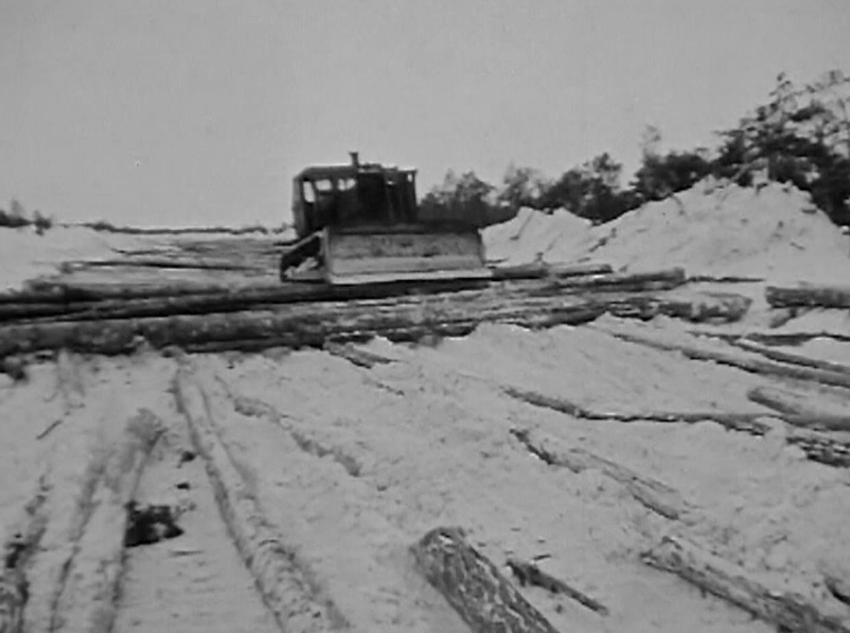 Передвижное основание под буровую установку — уникальная инженерная разработка начальника «Главтюменнефтегаза» Виктора Ивановича Муравленко. Еще он придумал строить «ледовые дороги». Зимник регулярно покрывали отходами с лесозаготовок и проливали водой, чтобы создать толстую ледяную корку. Она не таяла до июня и позволяла летом проехать по болотам, чтобы доставить на буровые оборудование, топливо, продукты питания.
