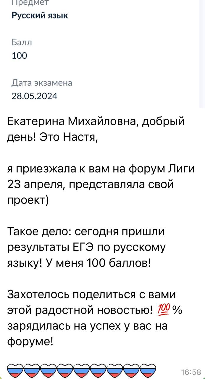 «Настя из Тюмени приезжала к нам в гости на Форум безопасного интернета, где она представляла свой проект, — рассказала Екатерина Мизулина в своем телеграм-канале. — Она приехала по моему приглашению, ее идея мне показалась интересной. Она рассказала о том, что получила 100 баллов на ЕГЭ по русскому. Поздравляю».