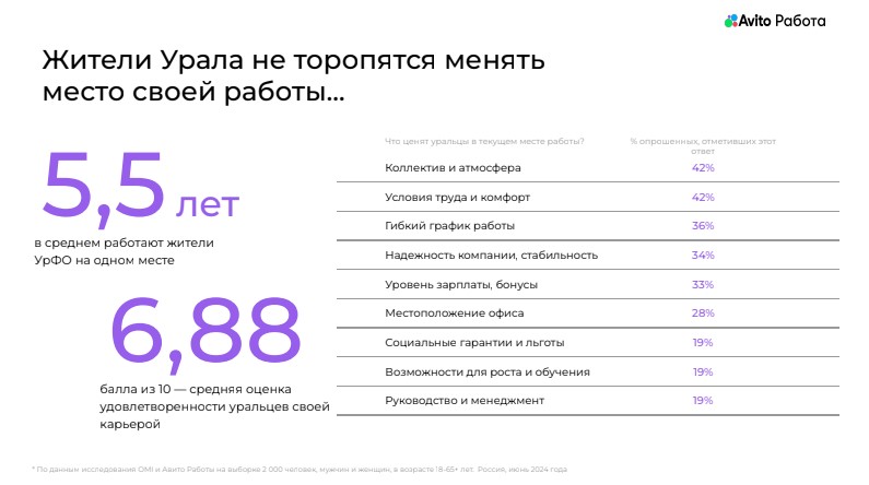 В среднем жители Урала работают на одном месте 5,5 лет и оценивают уровень удовлетворённости своей карьерой на 6,9 балла из 10.