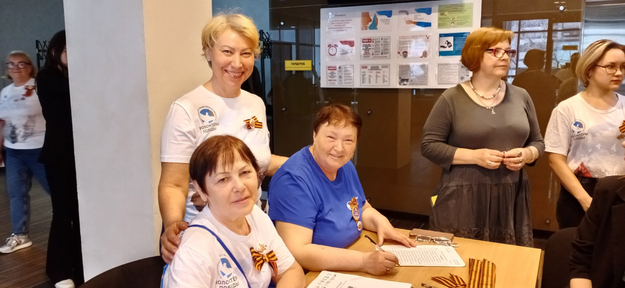 У дверей всех желающих проверить свои знания встречали волонтеры Победы — с песнями и улыбками. Каждому на грудь прикалывали георгиевскую ленту — символ Победы — выдавали ручку и бланк.