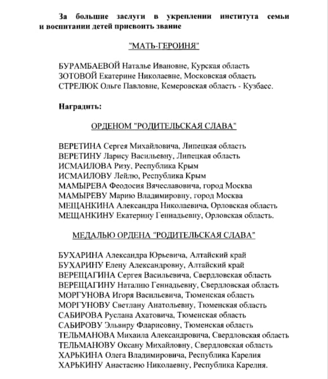 Две семейные пары из Тюменской области награждены медалями ордена «Родительская слава». Указ подписал президент России Владимир Путин. Супруги награждены за большие заслуги в укреплении института семьи и воспитании детей.