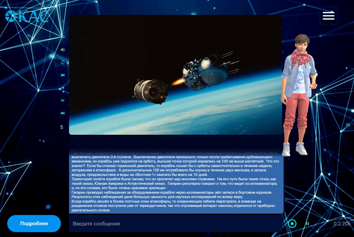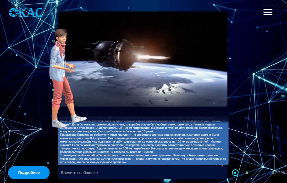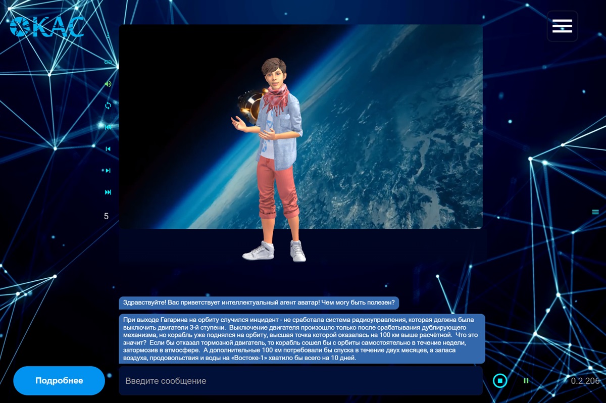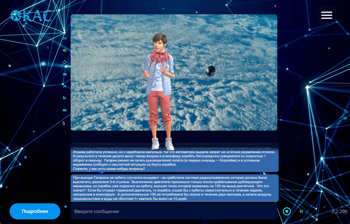 Аватар рассказал ребятам о том, какой была подготовка к первому космическому полету, каким образом отбирали космонавтов и, конечно, о том, что происходило с кораблем «Восток-1» на орбите. Искусственный интеллект ответил на все вопросы о первом полете, заданные ребятами, сам задал встречные вопросы и оценил ответы ребят.